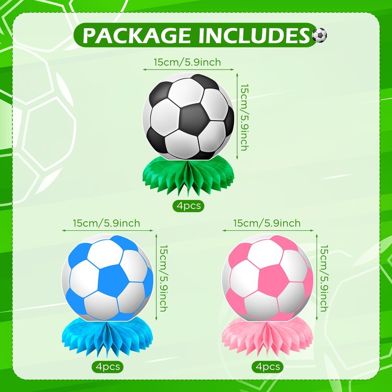- ⚽【Soccer Theme Birthday Party Decorations Set】There are 12pcs soccer ball centerpieces (3 different colors). Funny and wide variety of soccer theme party decorations for all kids. All these soccer ball honeycomb centerpieces are printed with clear and cute patterns. It is a very clever package for a football and soccer party.