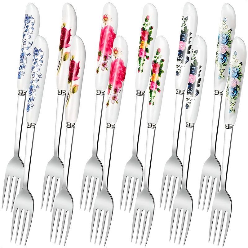 Stainless Steel Forks Set of 12 Dessert Fork Set Fruit Forks for Kids Lunch Reusable Forks: These stainless steel dinner forks are ideal for everyday usage, hotels, restaurants, parties, holiday meals, and other occasions. These heavy duty dinner forks have thick and weighted steel which is difficult to bend and are sharp enough to easily cut pork meal. This solid and long lasting long fork is easy to clean and dishwasher safe. Floral artwork printed on ceramic dinnerware set fork that look very appealing and attractive. The mirror-like finish of this kitchen silverware set brings out the genuine brilliance of the steel itself. These dinner forks set of 12 stainless steel have smooth edges with no rough patches. These dinnerware set for 12 forks have a nice weight and length, not too heavy, not too light. These kitchen forks only are well balanced and comfortable to hold. These stainless steel kitchen set forks with round edge design look elegant and classic so match well with your existing dinnerware and kitchen style. The smooth edge of this reusable fork would not hurt the mouth and hands. The ergonomics handle of these meat forks for kitchen are easy to hold. These forks would complement your current tableware with royal look to your regular meals and for parties. Specification Material: Ceramic, Stainless Steel Size: 8.3 x 1.0 x 0.5 inches Color: Silver Package Include: 12 x Stainless Steel Forks