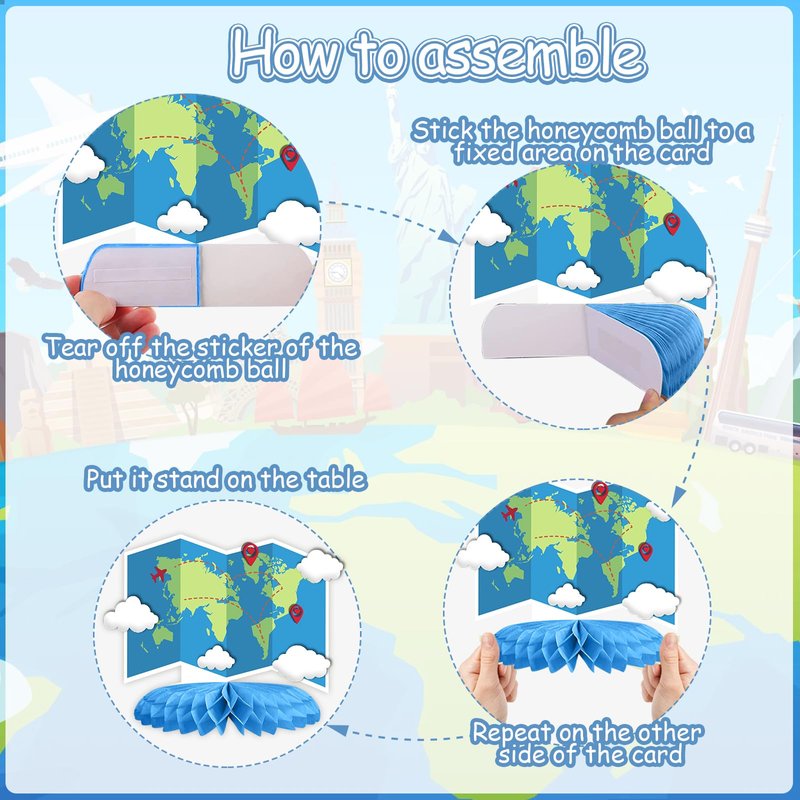 - Easy To Assemble: Simply peel off the sticker of the honeycomb ball, stick the honeycomb ball to the fixed area on the card, and then repeat the above steps on the other side of the card. The eye-catching travel honeycomb centerpiece will be on your table.