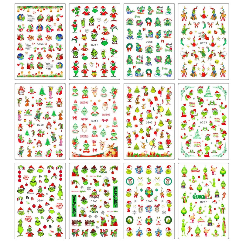 12Sheets Christmas Nail Art Stickers Green Fun Cartoon Santa Claus Designs Nail Decals Xmas Tree 3D Self-Adhesive Winter Holiday Nail Decoration Xmas DIY Manicure Accessories Supplies for Women Kids