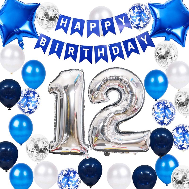 • 12th Silver Blue Birthday Decorations Blue Sets Include: 1 * blue 'HAPPY BIRTHDAY' Letter Banner, 1* Jumbo 12 number foil balloons, 2* star foil balloons, 25 latex party balloons in 5 styles(5* blue color, 5* white confetti, 5* white, 5* navy blue, 5* blue confetti), 1* 10m ribbon. Total 31packs in one package.