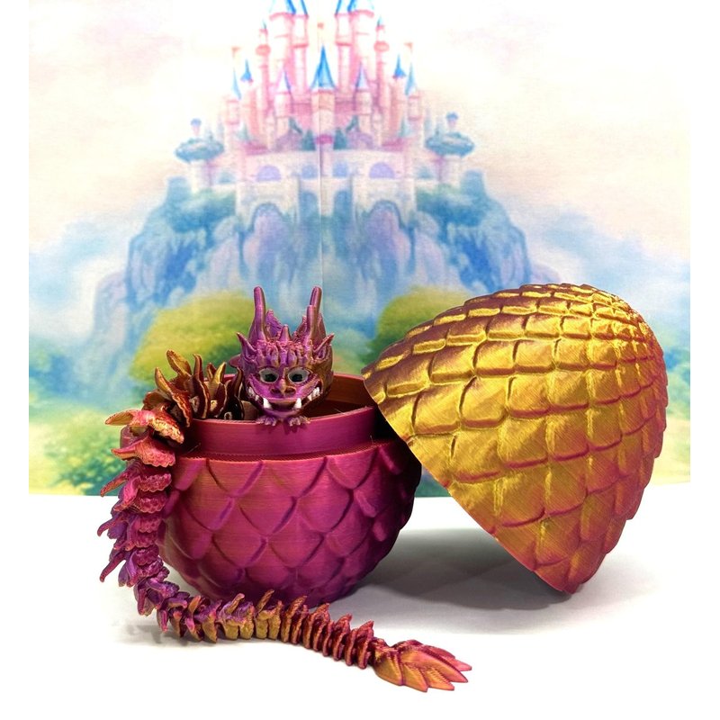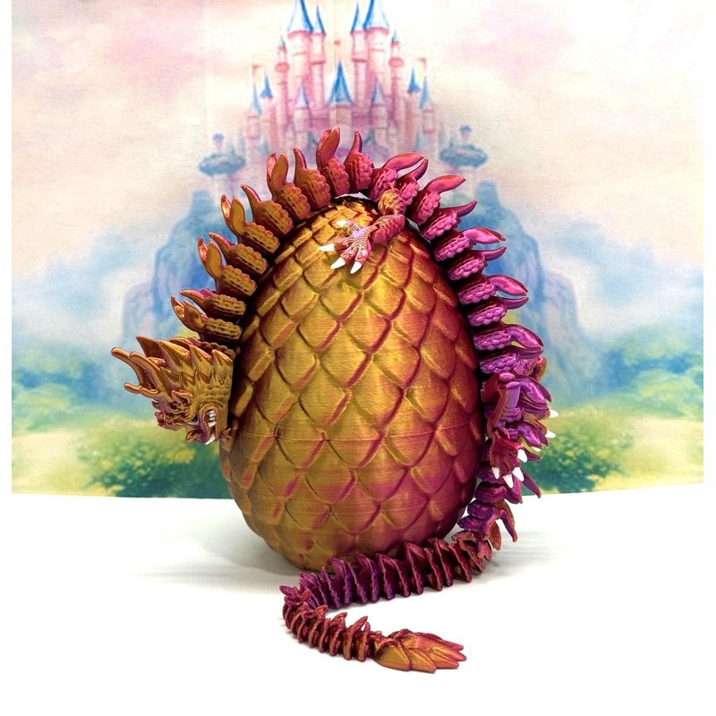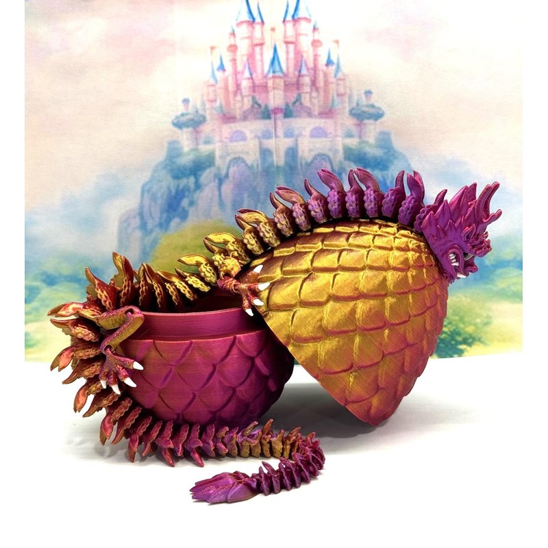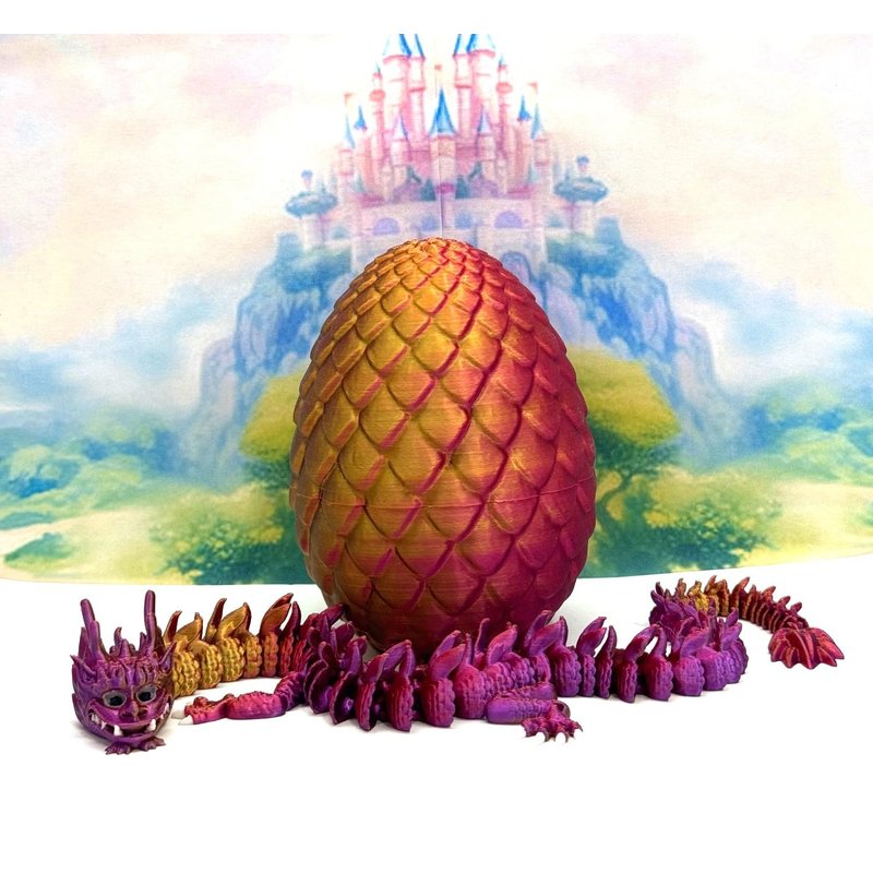 3D Printed Articulated Imperial Dragon Dragon with Dragon Egg - a mystical creature that brings a touch of fantasy to your world. Unveil the mystery of this Red Purple Gold Dragon, a captivating fusion of elegance and fantasy. This dragon reveals itself with a symphony of colors - a testament to its magical heritage. ------- Small Components Advisory: ------- Please note that this product may contain small components and might not be suitable for very young children. Given the characteristics of 3D printing, there is a potential for small components to detach if handled aggressively or dropped. Therefore, we advise against allowing younger children to interact with the dragon. Please consider that 3D printed objects might include minor imperfections such as layer lines. These are a natural and inherent aspect of the printing process. We strive to produce the highest quality items, and these imperfections contribute to the unique character of each piece. Remember the unique creation of each dragon, crafted exclusively for you. The color selections available are depicted in the provided photos. Please be aware that variations in color may occur due to discrepancies in filament production and the characteristics of the monitor or screen you are utilizing to view the listing. Additionally, the arrangement of prints using multi-colored filament rolls can influence color distribution. ------- Licensing Information: ------- Authorized Design: NOHo3D holds the official authorization for the production of this exquisite design created by FlexiFactory.