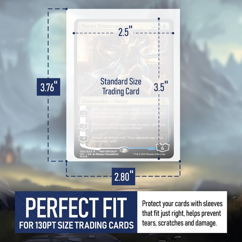 - Fits up to 130PT Card Thickness: Protects your Trading, Gaming, Sports Cards and more. Sleeve dimensions are 2.8" x 3.75" (71mm x 95.5mm).
