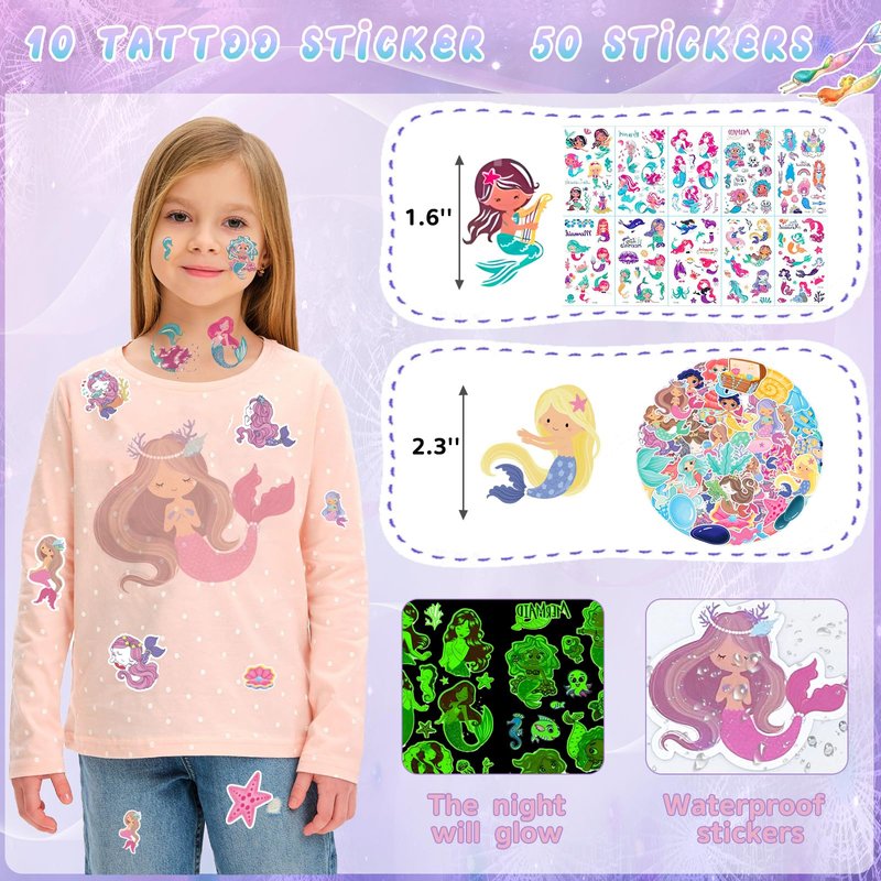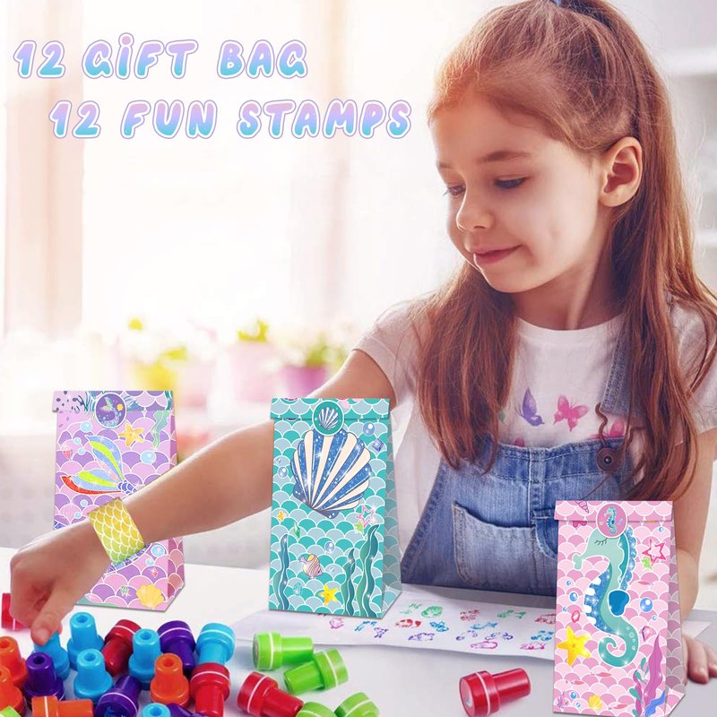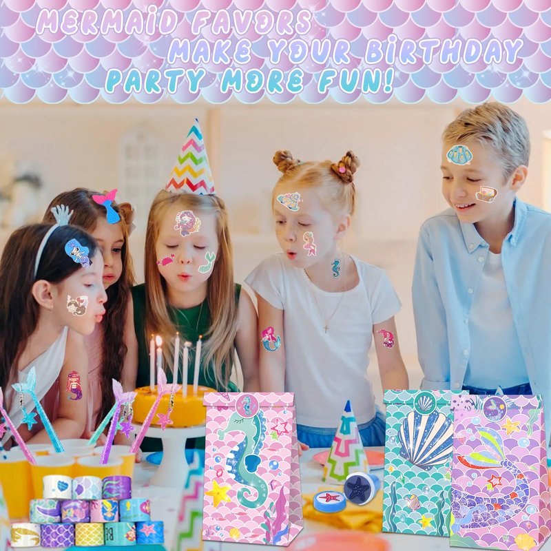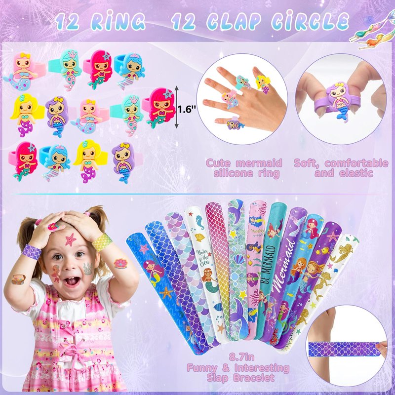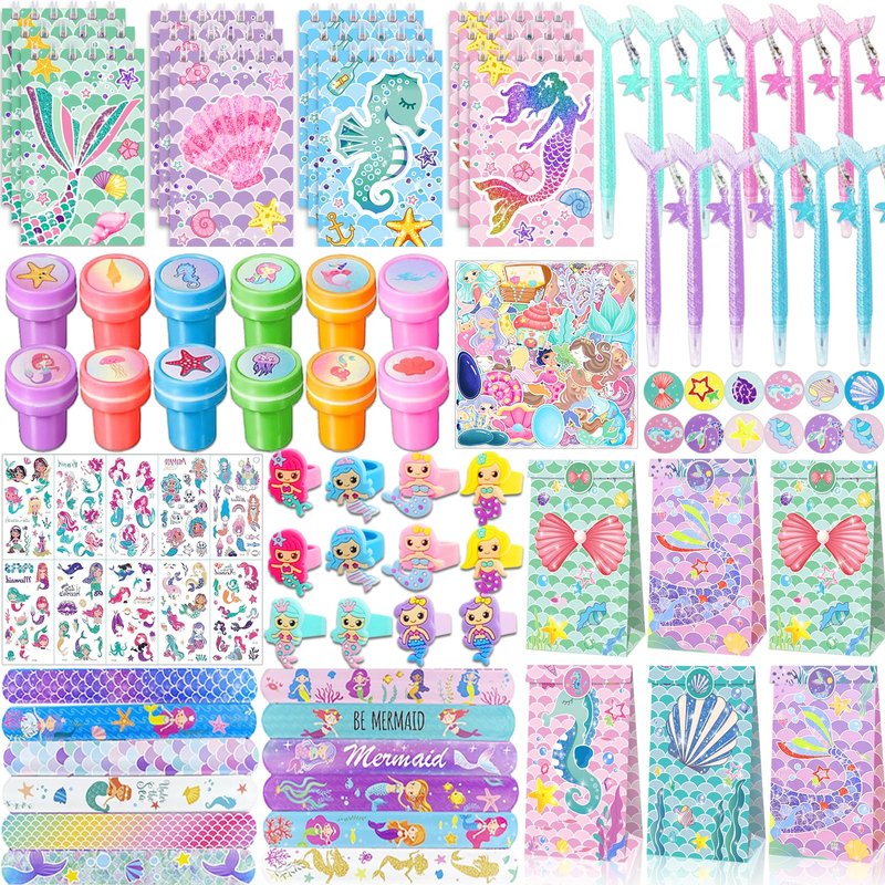 - Mermaid Birthday Party Favors Contains - 50pcs mermaid stickers, 12pcs mermaid-patterned slap bracelets, 12pcs mermaid-shaped rings, 10pcs hairpins for girls, 12pcs stampers, 12pcs mini notebook for children, 12pcs rollerball pen, 12pcs party bags. The dazzling mermaid party favors are sure to be loved by the babies present.