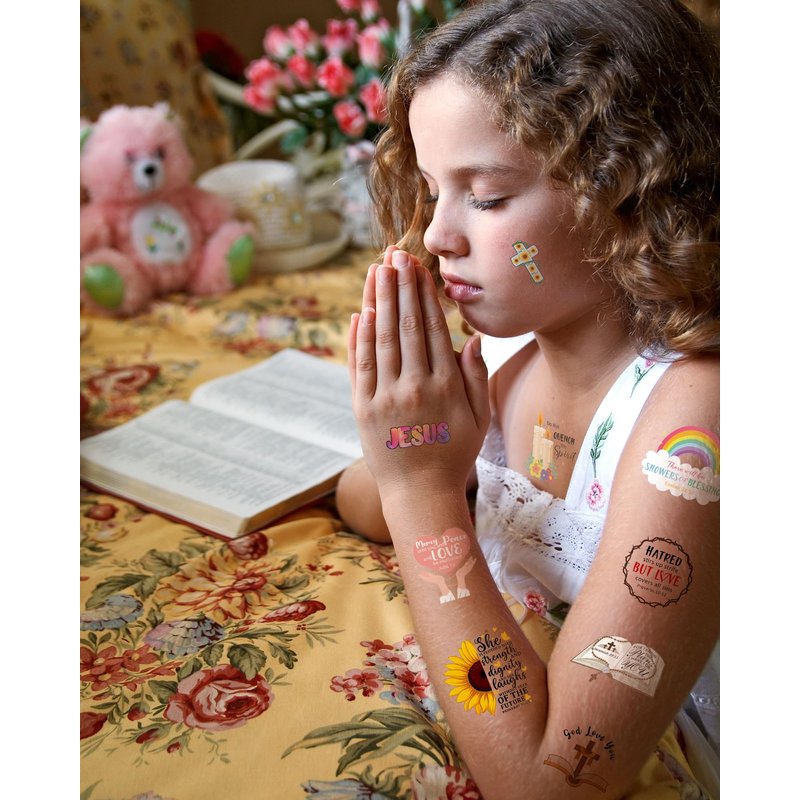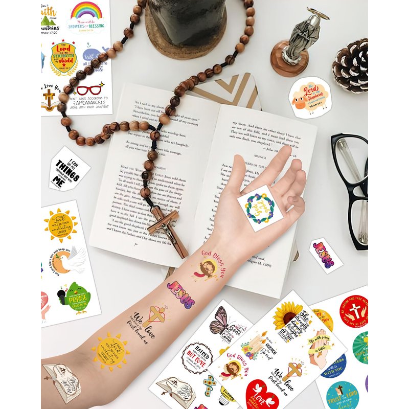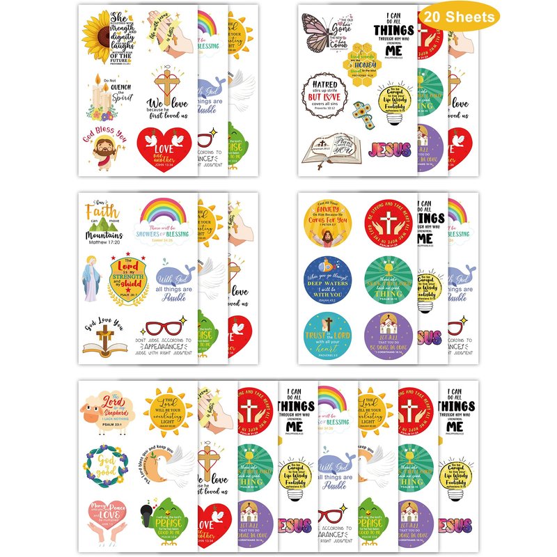- Bible Verse Scripture Theme Party Decorations Design,20 sheets with 132 pieces of Religious temporary tattoos with vividly colorful psychedelic art from Bible,For example alpaca, bible, angel, GOD Love YOU, Fish, cross, dove, and more