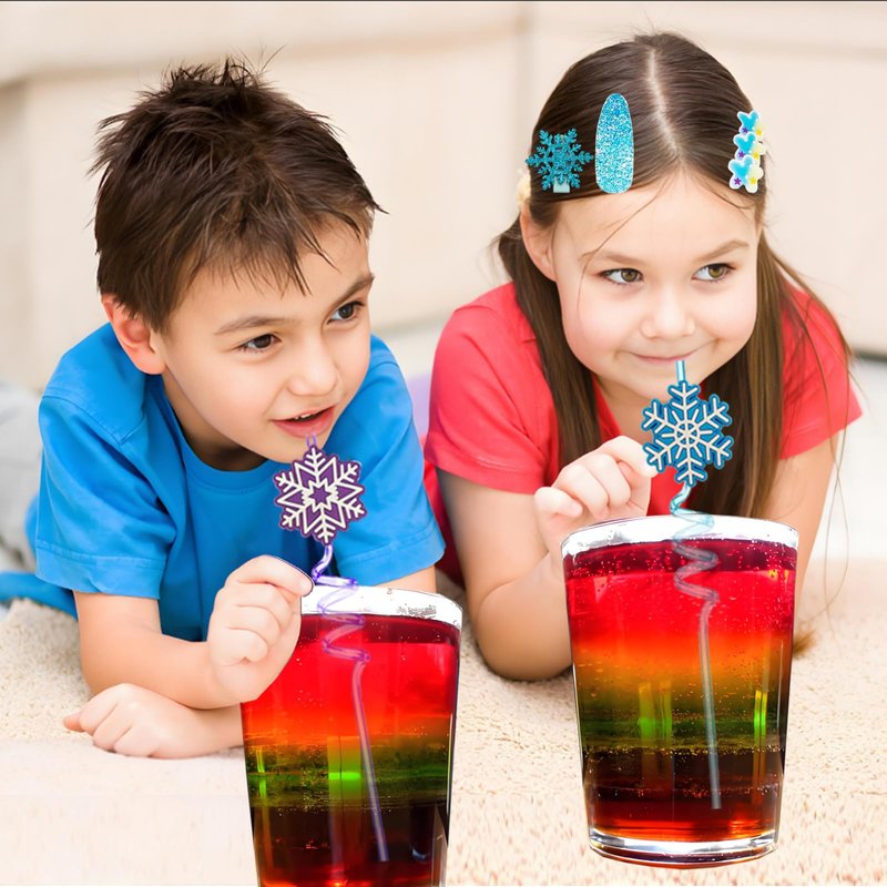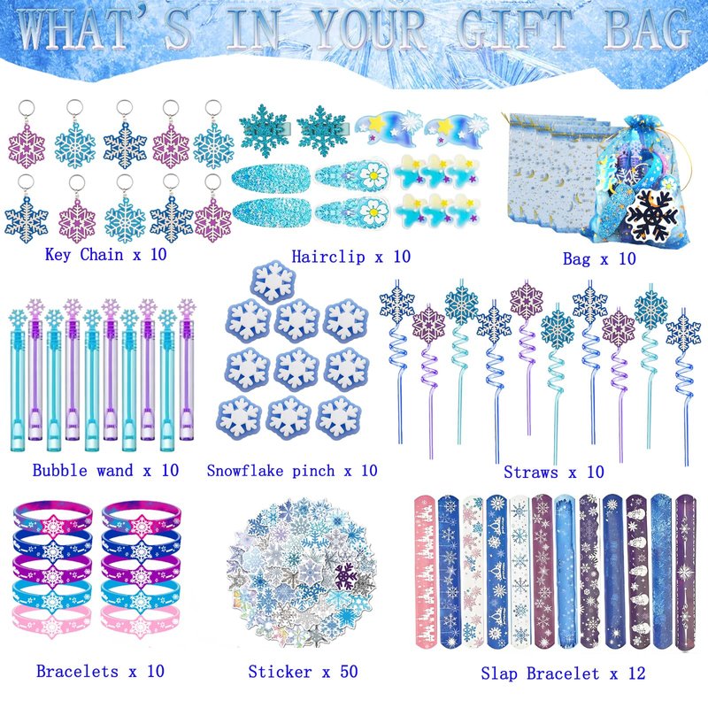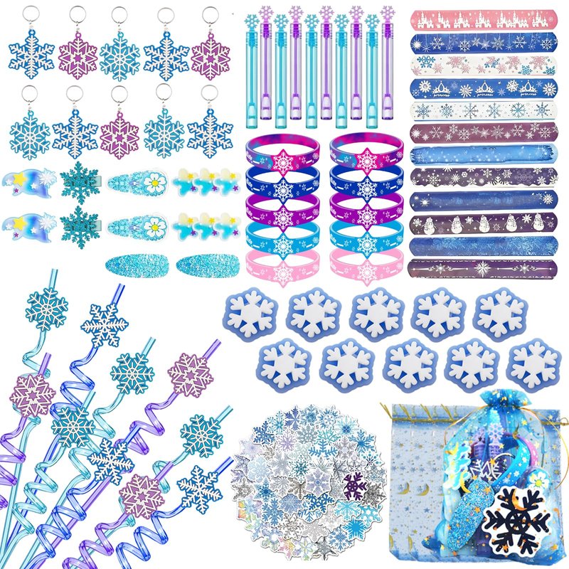- Snowflake Party Favors: Our company recommends this snowflake themed party favor set, including slap circle,keychain,snowflake squishies,stickers,gift bags,wristbands,hair accessories,straws,bubble,stickers. It can be a great fun addition to the whole party, or it can be given as a souvenir to the kids as a kickback gift for the party.