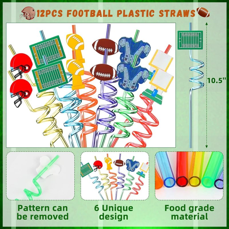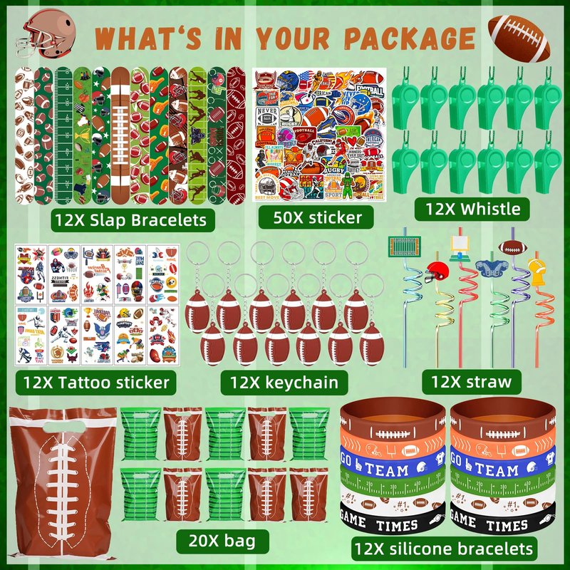 - đăFootball Party Decorations Gift SetăThis football themed party favors set contains 12 football silicone bracelets,12 whistles, 12 football keychain, 12 slap bracelet, 12 tattoo stickers, 12 plastic straws, 12 gift bags, 50 football stickers. Children and adults will love these football party supplies! Itâs a perfect football party favors gift for kidsâ football birthday party decorations.