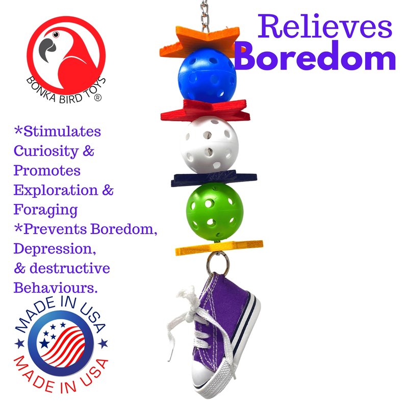 The 1355 Kickball Sneaker from Bonka Bird Toys is a super bird enticing chewable and pullable medium-sized bird toy! This appealing bird toy has a great assortment of materials and parts to thrill your feathered friend! At the top of the bird toy, there is a quick link attachment for fast and easy hanging in the aviary. A small sturdy link chain hangs down from the connector continuing through the entire toy ending with a small metal ring. This metal ring has an assorted color bird-safe cotton sneaker hanging from it. The sneaker is brightly colored, and has bird-safe laces that can be pulled on the front and real sneaker parts including a soft rubber sole. On the main body of the bird toy there are (4) colorful wooden chew stars that each separate a jingle ball. These (3) jingle balls have small rattlers inside of them and make wonderful bird-pleasing noises whenever the toy is played with. The small sturdy link chain allows this toy to swing all about when your pet plays with it and the assorted colors make it stand out in any cage. The 1355 Kickball Sneaker is 100% bird-safe, ships in assorted bright bird pleasing colors, and weighs and measures approximately: Height: (12.75) inches or (12 3/4) inches Width: (2.5) inches or (2 1/2) inches Weight: Under (4) ounces