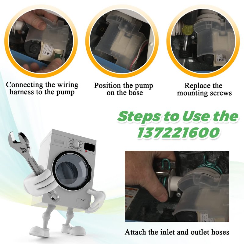 - ✔✔【DIY INSTALLATION】Disconnect the power before installing this part. Wear work gloves to protect your hands. You’ll just need a Phillips screwdriver, pliers, towel, needle nose pliers, and small flathead screwdriver. The 137221600 Drain Pump Replacement is typically located at the bottom of the washing machine, and it is connected to the motor with two screws. Washer pump 137221600 is easy to install, you can find the repair video on YouTube and follow it to install it. Just a heads up once the pump is removed make sure you clean out the rubber boot and make sure your hose is fastened to the drain