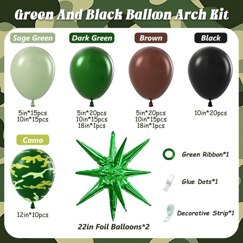 • Package Include: The camo balloon arch kit included 36pcs dark green balloons(18inchx1, 10inchx15, 5inchx20), 36pcs brown balloons(18inchx1, 10inchx15, 5inchx20), 30pcs sage green balloons(10inchx15, 5inchx15), 10inch black balloonsx20, 12inch camo balloonsx10, 22inch foil balloonsx2, glue dotsx100, green ribbonx1, decorative stripx1