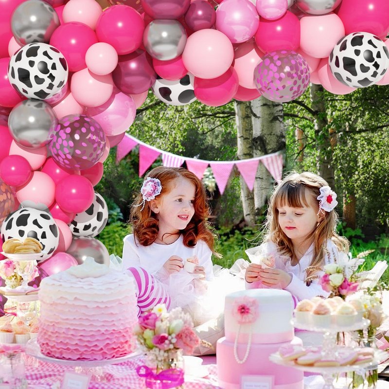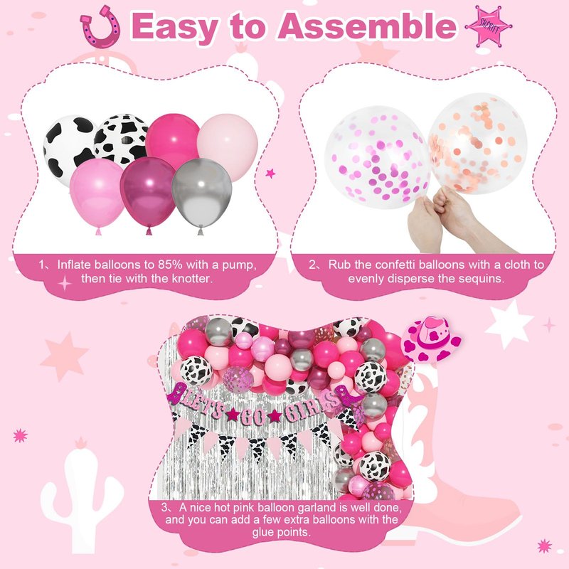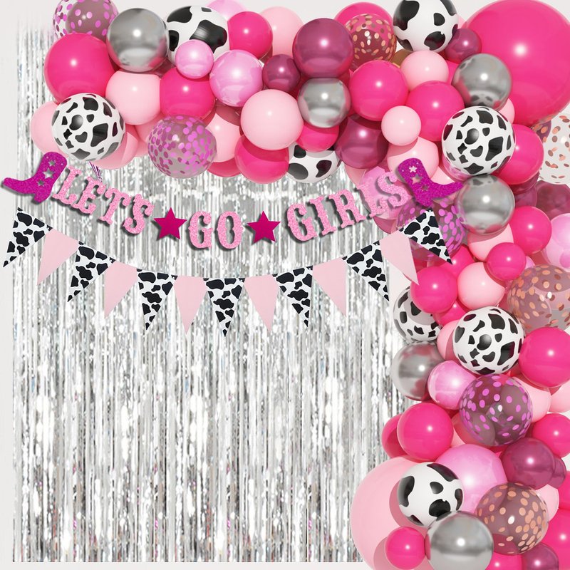 - Cowgirl Party Decorations: You’ll get lots of complements: silver foil fringe curtains, cow print pennant banner, LET’S GO GIRLS banner, 18"latex baby pink and hot pink balloons, 10pcs 12"rose red/rose gold confetti balloons, 10pcs 12"cow print balloons, 26pcs 10"5"metallic silver/red balloons, 60pcs 10"5"latex balloons(30rose red, 30baby pink), 20pcs 10"5"pearlescent pink balloons and balloon tools. It includes all cowgirl balloons you may need.