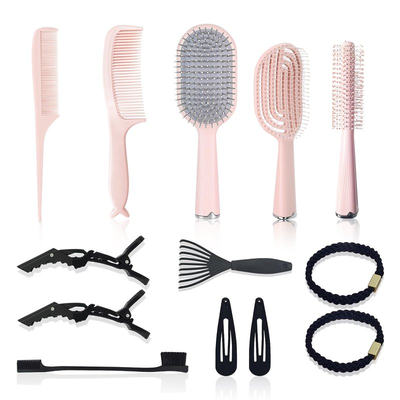 Elevate your hair care routine with this versatile set of brushes and combs. Crafted with sleek, pink handles, these tools are designed to effortlessly detangle, smooth, and style all hair types. The set includes a paddle brush with sturdy bristles for gentle detangling, a round brush for adding volume and bounce, a wide-tooth comb for evenly distributing hair products, and smaller combs for precise styling and parting. Whether you're taming frizz, creating intricate updos, or simply brushing out knots, this comprehensive set has you covered. The variety of shapes and bristle types allows for customized grooming to suit your unique hair needs. Achieve salon-worthy results from the comfort of your home with this must-have hair brush collection.