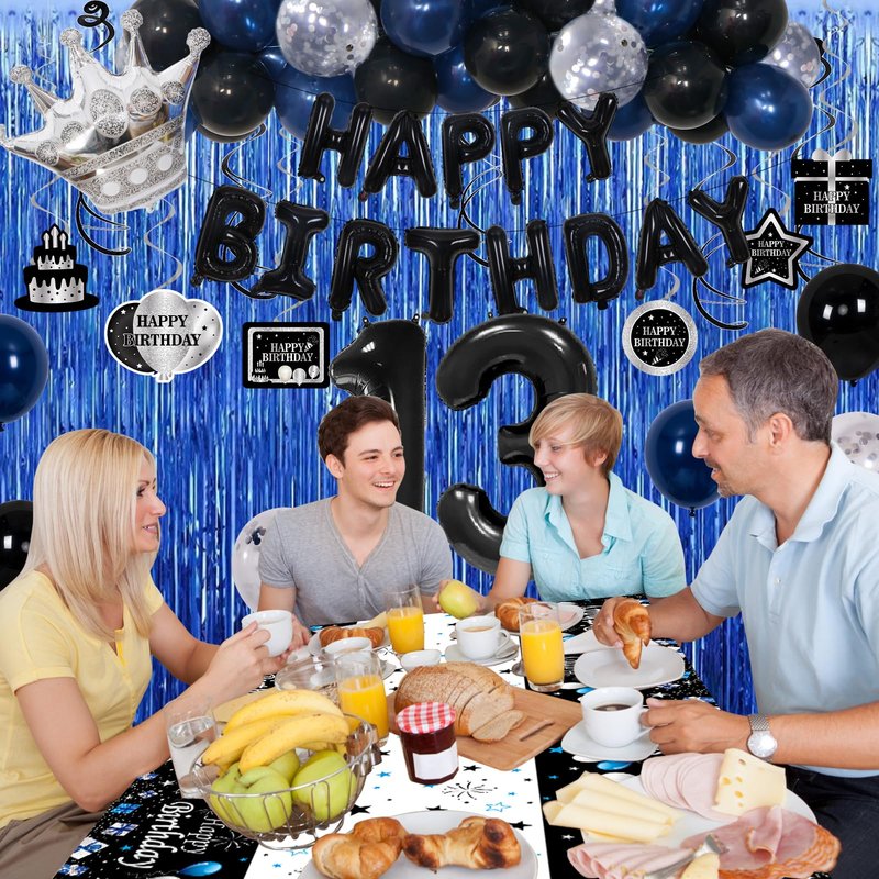 - 73PCS Great Value boys 13th birthday decorations include 1 x black HAPPY BIRTHDAY Balloons banner, 1 x 32" number 13 foil balloon, 2 x blue fringe curtains, 1 x birthday tablecloth, 6 x happy birthday pattern card, 6 x black hanging swirls, 6 x silver hanging swirls, 20 x 10” dark blue balloons, 15 x 10”black balloons, 10 x 12” silver confetti balloons, 1 x 12” crown foil balloon, 1 x balloon chain, 1 x dot stickers, 1 x ribbon.