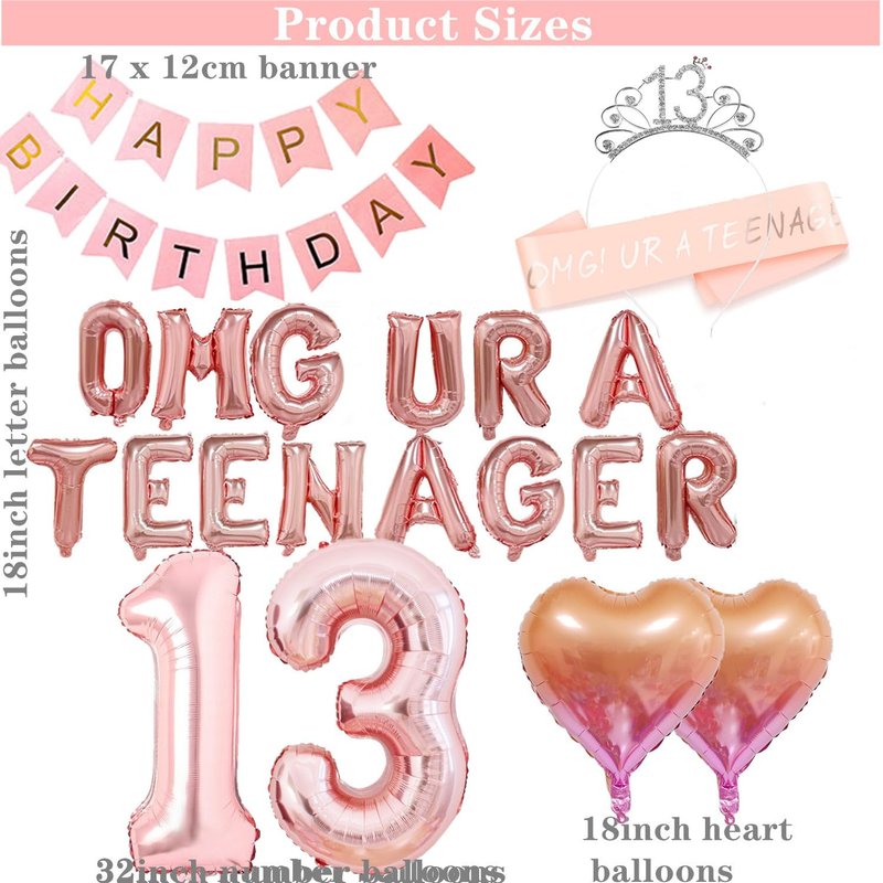 - 13th Birthday Party Decoration: 16 inch rose gold letter balloons banner "OMG UR A Teenager", 32inch number balloons "13", 2 pcs 18inch heart balloons, pink Happy Birthday banner, 1pc Omg Ur A Teenager sash, 1 pc sparkling 13th tiara, 20 pcs latex balloons, make your 13 year old Birthday party very special.