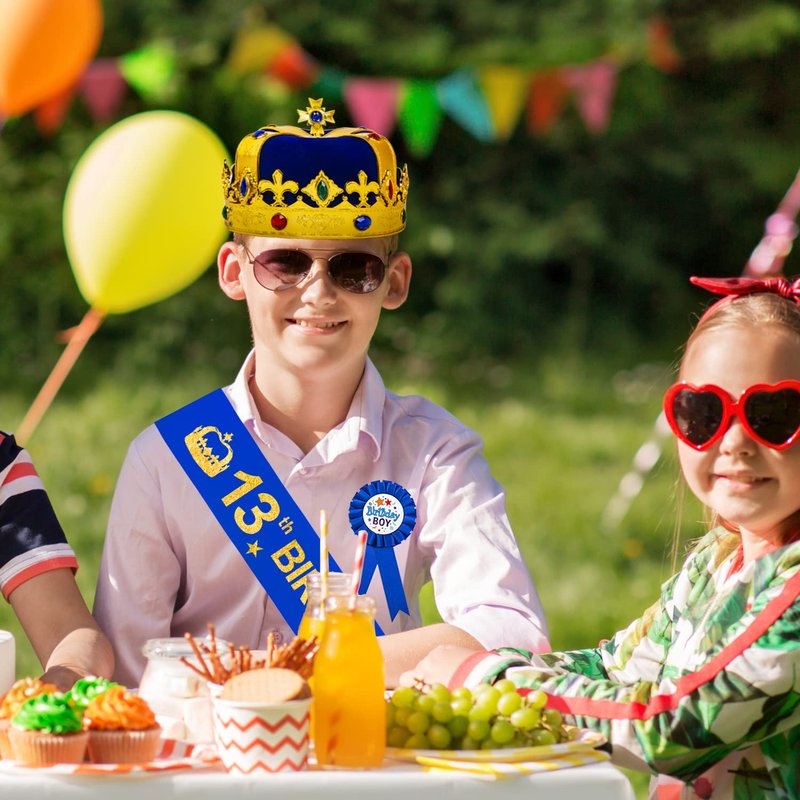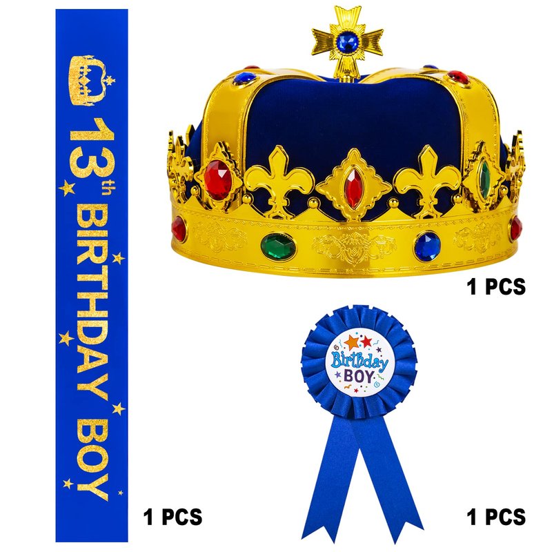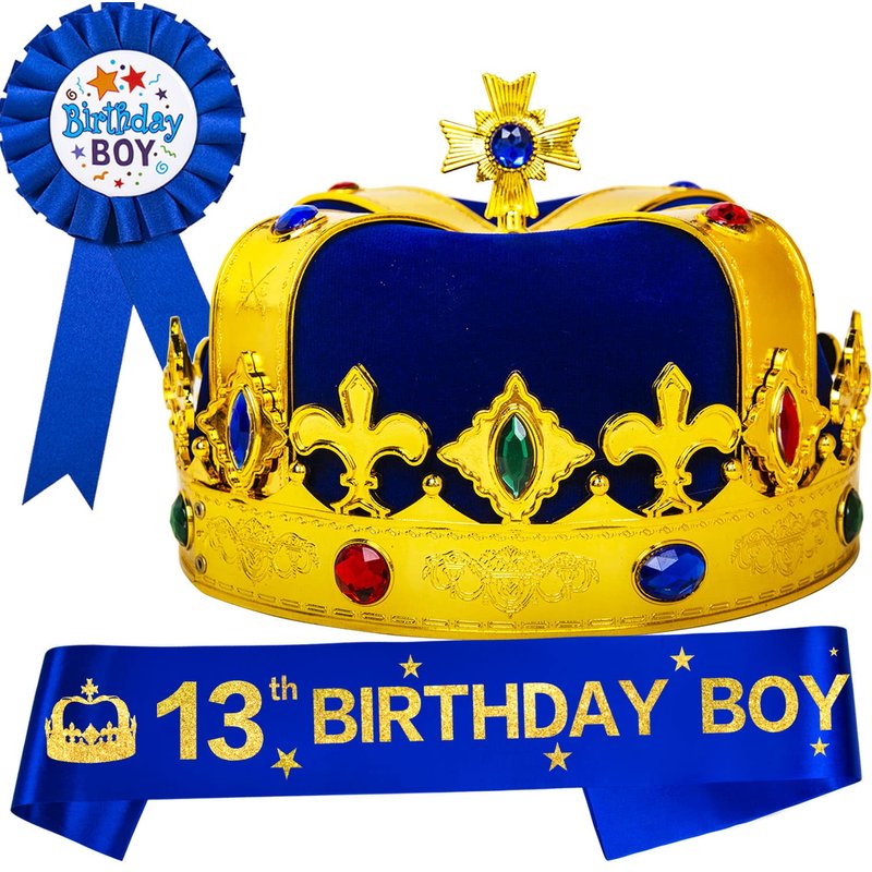 - Happy 13th Birthday: 13 Year Old Birthday Gifts set includes a Golden King Crown 13 Year Old Boy to match with 13th Bday Sash and 13 Birthday Pin. This 13 Crown for Boy is decorated with rhinestones and made of high quality of material that makes 13th Crown durable and long lasting. This 13th Birthday Hat sure will make your 13th Birthday Boy stand out from the 13 Birthday Party