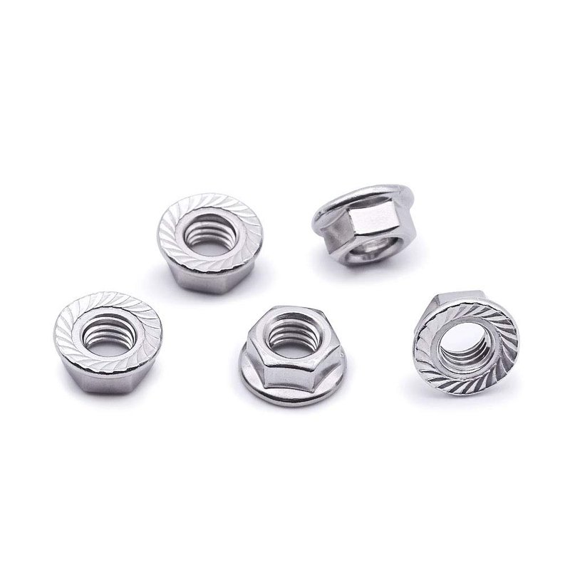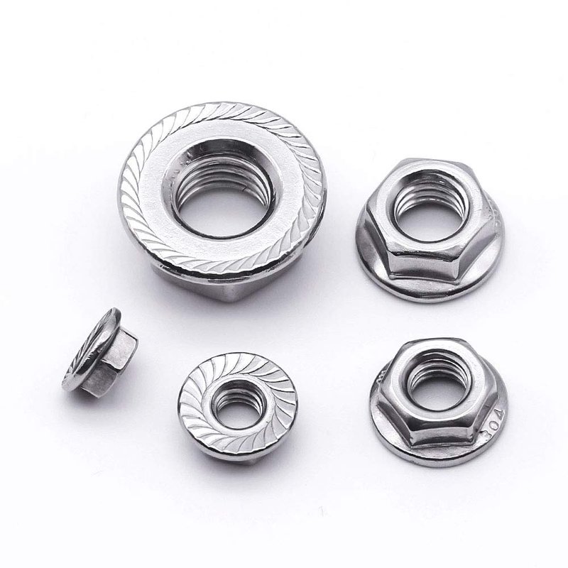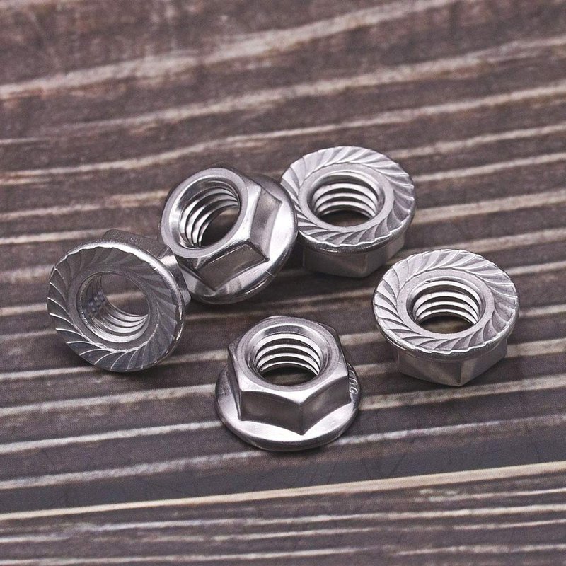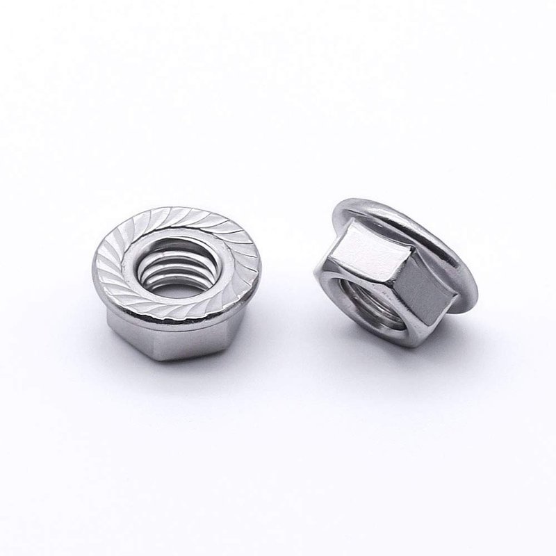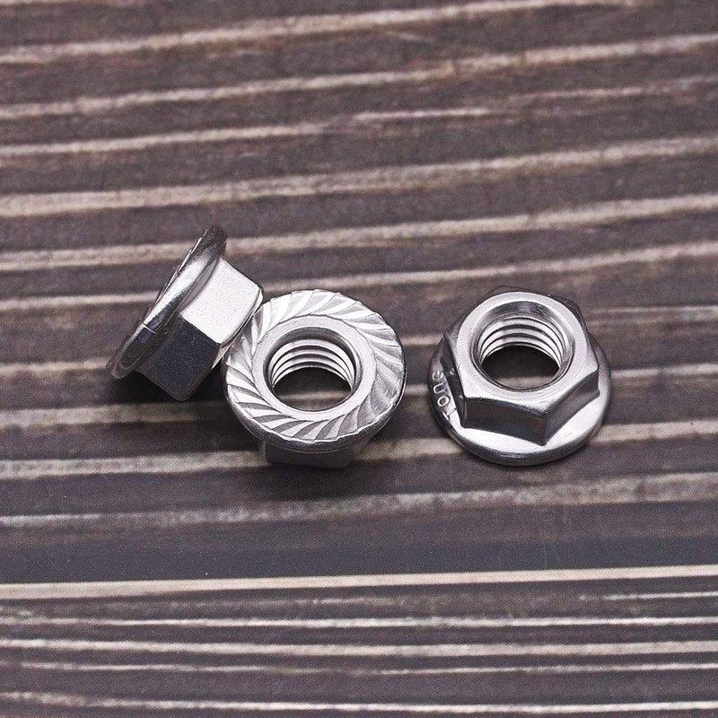 br>Flange nuts have a washer-like base to distribute pressure over a greater surface area and ensure the fastener stay tight. Flange nuts have flat and serrated designs. Serrated flange nuts are fabricated with a built in serrated washer that resists loosening due to vibration.They are commonly used in assembly lines where operations are speeded by using a single fastener instead of a nut and a washer.