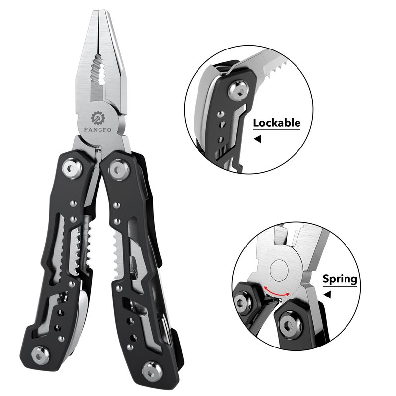 - Safety Locking: fangfo Multitool With side lock design, every tool and knife ( except the pliers heads ) will be locked when fully open.