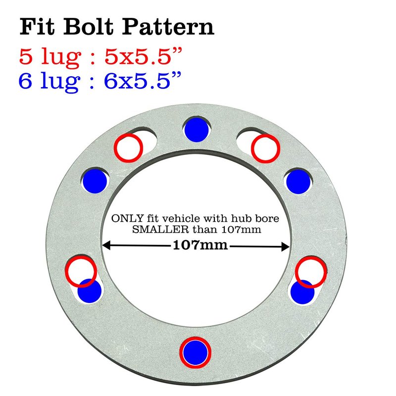 - ☛ 4 pcs Universal Wheel Spacers - Each spacer measures 1/4 inch (6mm) thick, ONLY fit vehicles with hub bore SMALLER than 107mm, Inner diameter 107mm, Outer diameter 178mm