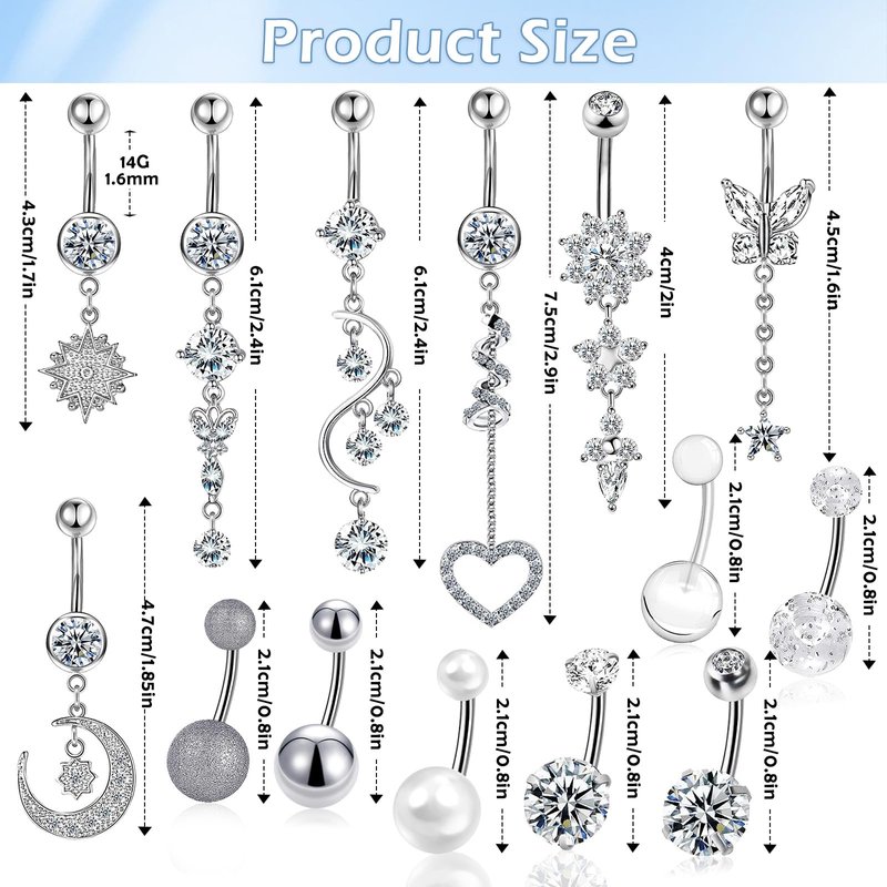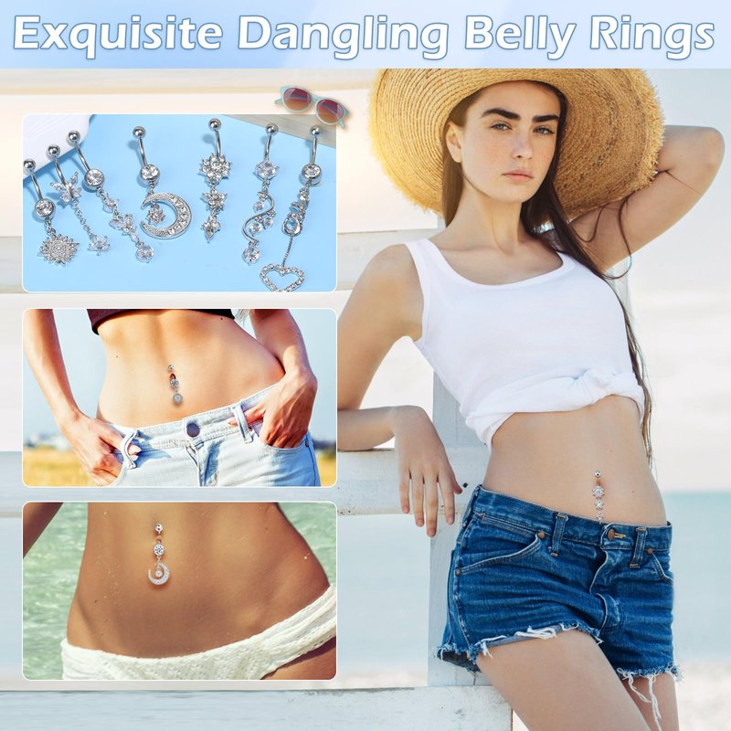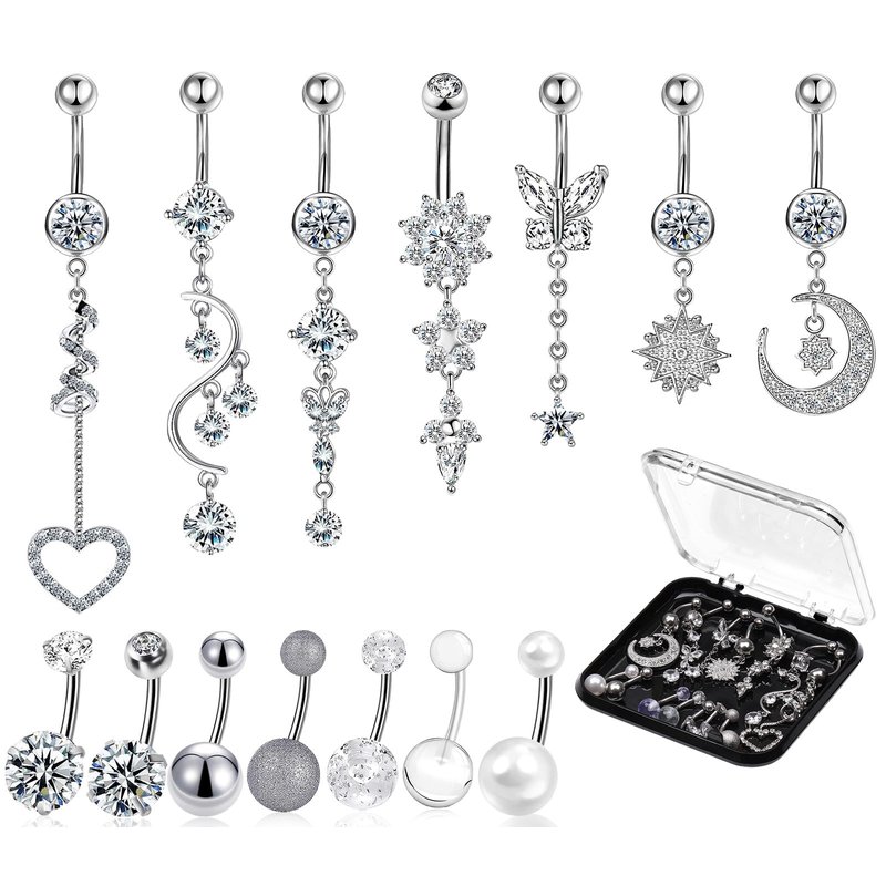 - ✅14 PCS Jewelry Piercing Navel Rings✅ There are 14 types of body piercing jewelry kits, including 7 different long dangle Rings and 7 styles of short bar belly button rings, snow shape, flower, moon, heart, butterflies, etc. Each is in individual baggies and neatly packed in a plastic box, which makes storage easy and changes your style in daily life.