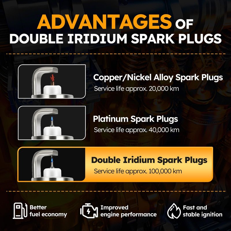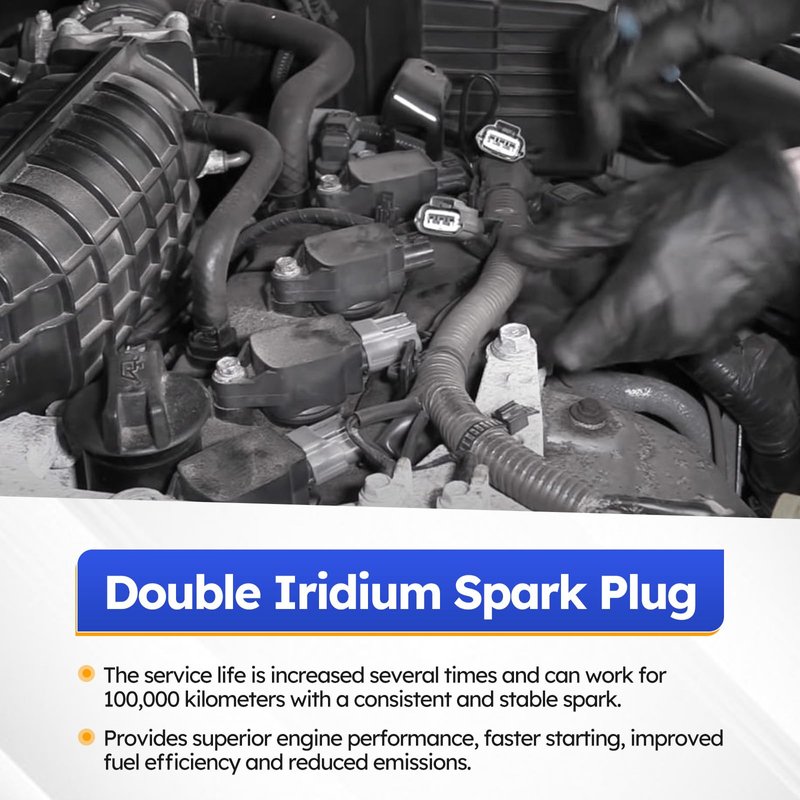 - ✔High-quality: The spark plug is double iridium spark plug, have a much longer working life, can work 100000 kilometers, consistent and stable spark. Iridium center electrode firing pin provides exceptional ignitability, faster starts and quicker acceleration, better fuel economy and lower emissions.