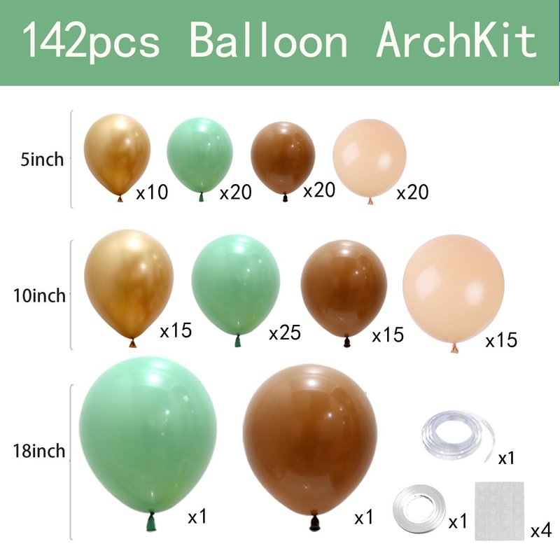 - 【Safari Balloon Garland Kit】: Total are 142 pcs. 142 pcs latex balloons: 18 inch brown and sage green balloons, 12 inch Metal Balloons,10 inch nude brown and retro olive green balloons, 5 inch coffee brown and sage olive green balloons. Balloons accessories 4 pcs: balloons strip 1 pcs, adhesive tape 1 pcs, ribbon 1 pcs
