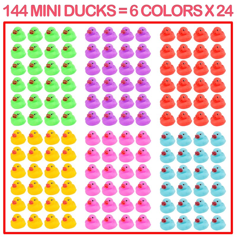 - Includes 144 pcs mini ducks in 6 different colors.The size of each duck is 1.4 x 1.3 x 1.2 inches.