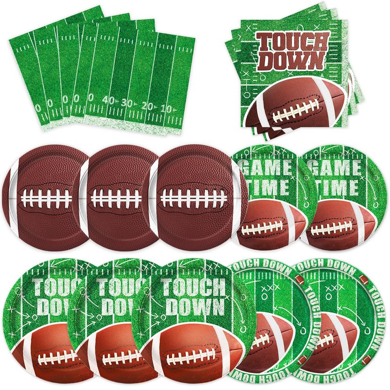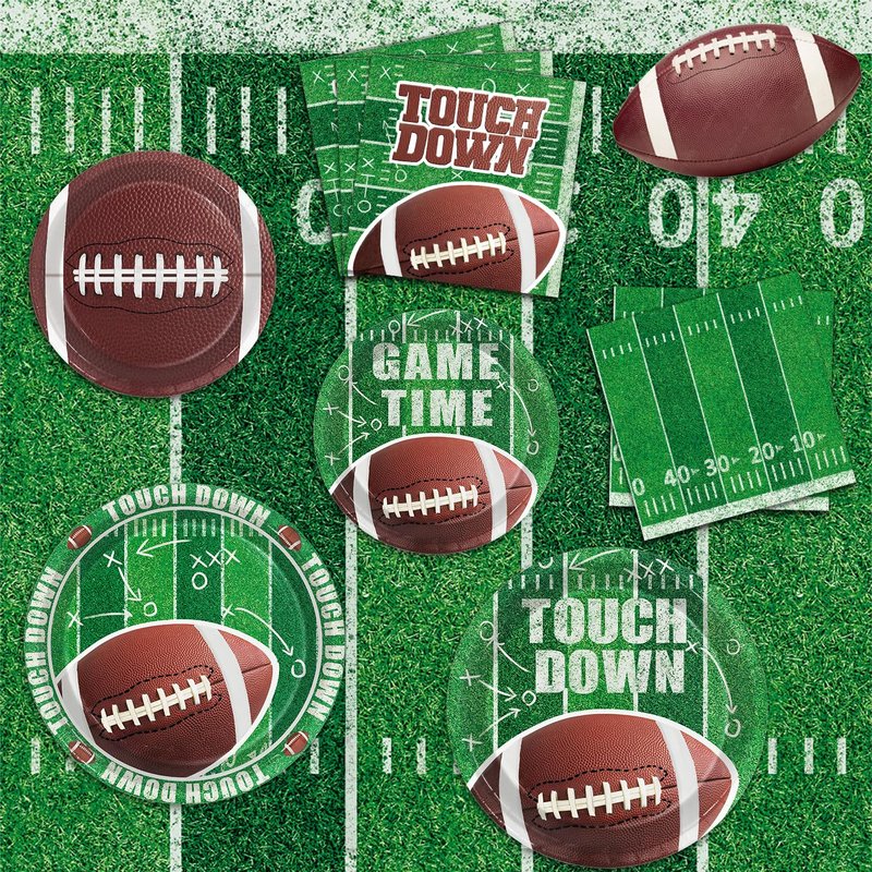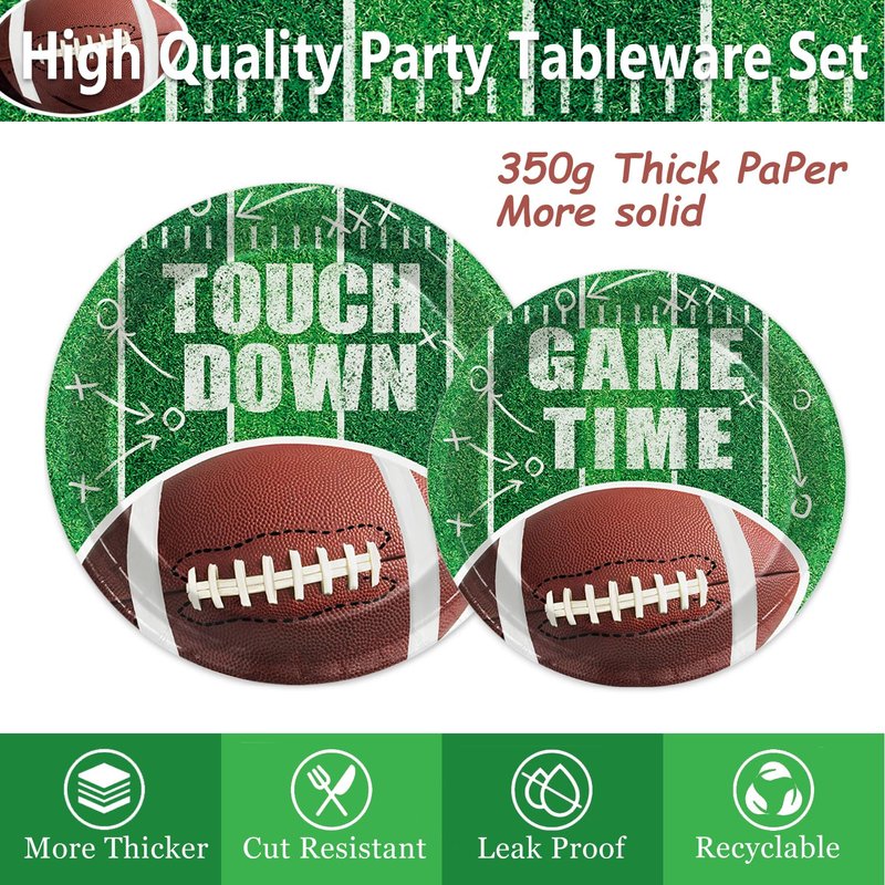 - 【Football Themed Design】: These football party supplies are desig ned with football elements such as the football, field, authentic green turf, midfield line, touchlines, in-goal area, scoring zone, try lines, 'TOUCH DOWN' and 'GAME TIME' words on our football party plates and napkins, adding a thrilling atmosphere to your party decor. Decorating your party with American football party decorations will be a fantastic choice.