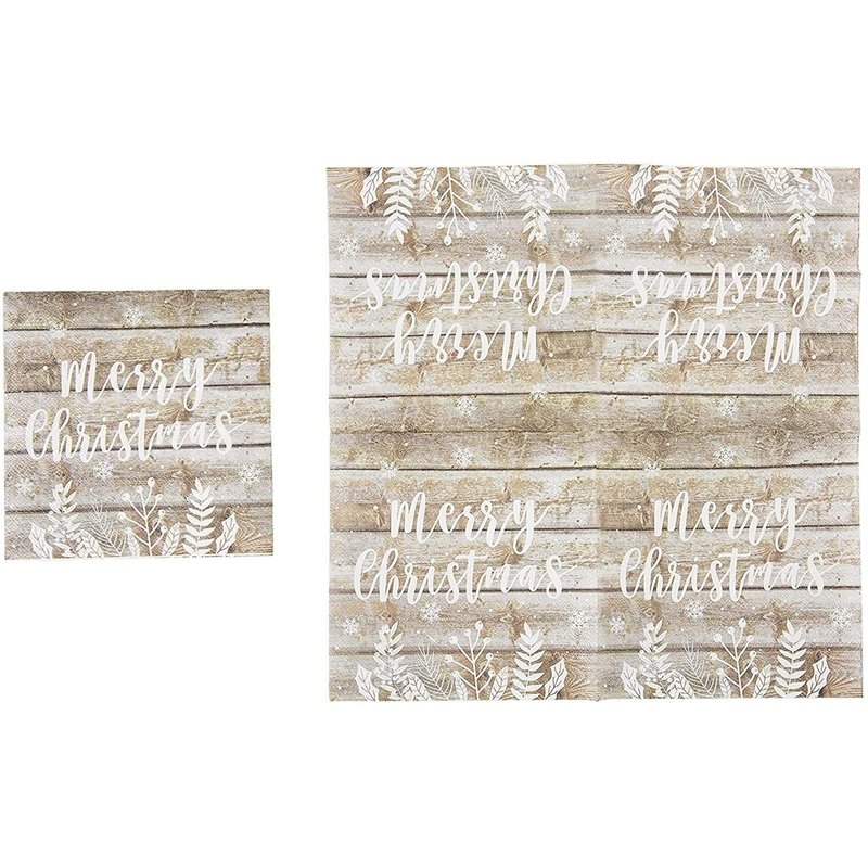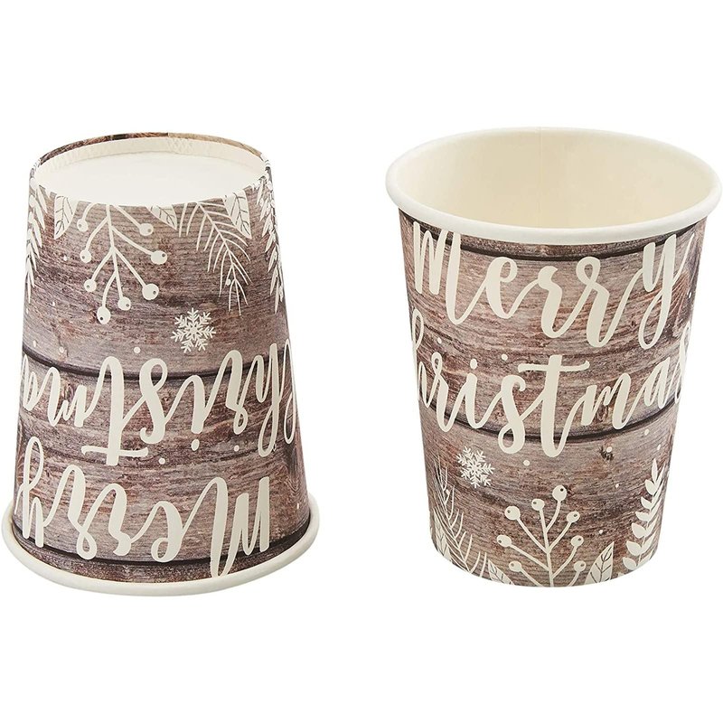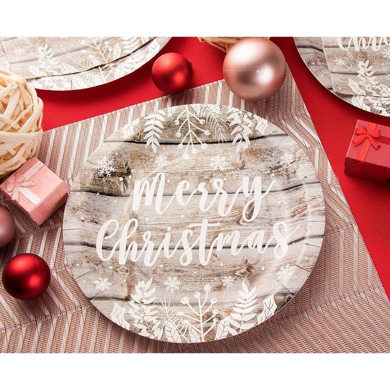 - Christmas Party Supplies: The rustic paper plates, napkins, and paper cups feature a wood plank design with text that states merry Christmas; ideal for creating a celebratory atmosphere for your upcoming holiday party
