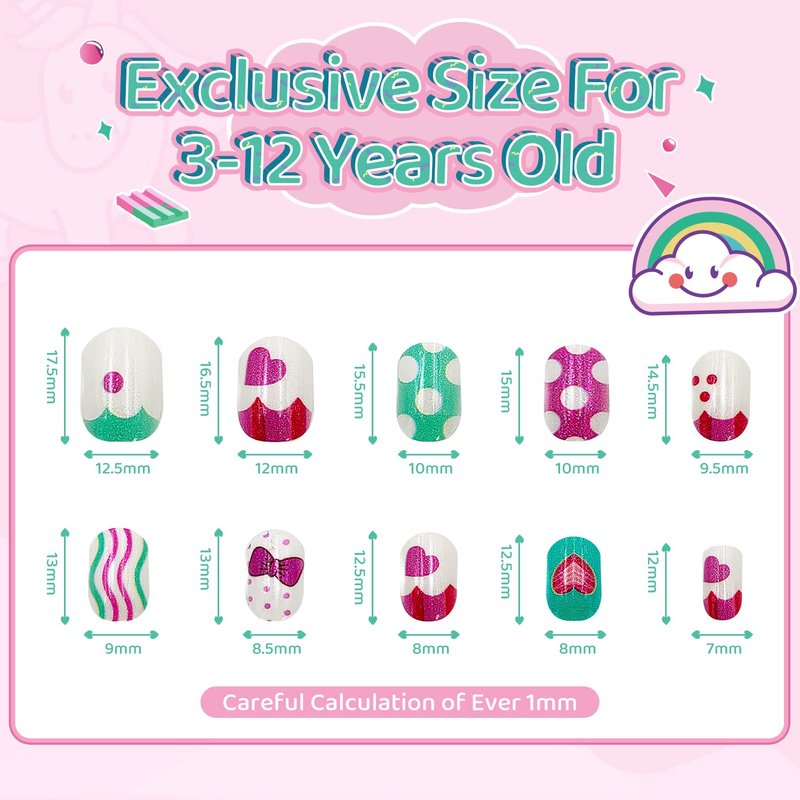 - ăEasy and convenient operationăThe kids nail stickers come pre-glued and are easy and convenient to apply, just choose the right artificial nail and stick it on your nails for about a minute to complete a cute nail art. When you are ready to try other designs, place them in warm water for 2 minutes and then gently peel them off from the side and the kids fake nail set for girls will come off without damaging your original nails.