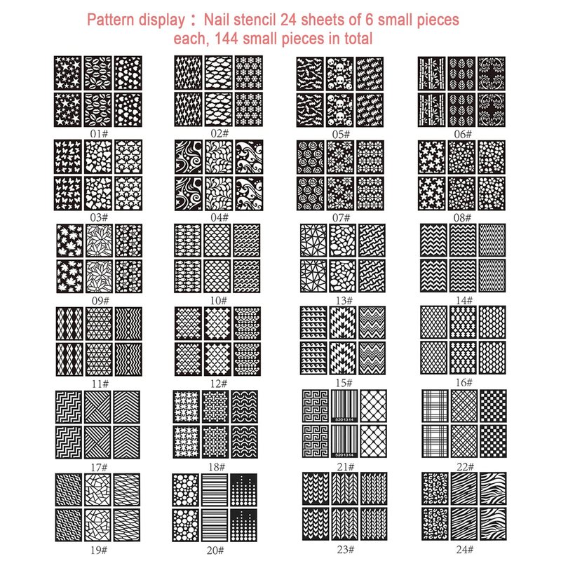 - Various patterns of nail art stencils. The package contains 24 sheets, each containing 6 small pieces with 3 different patterns, for a total of 144 small pieces of nail stencil stickers.