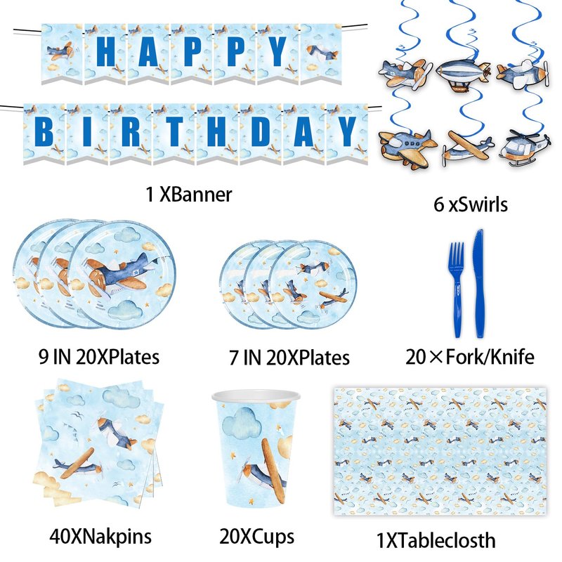- 【Package Include】You will receive 1* happy birthday banner,6* single spirals with cards, 1* airplane tablecloth with 137*274cm, 20pcs 7’’ plates, 20pcs 9’’ plates, 20pcs paper cups, 20pcs forks, 20pcs knives, 40pcs napkins, these airplane party decorations enough for your airplane party needs.