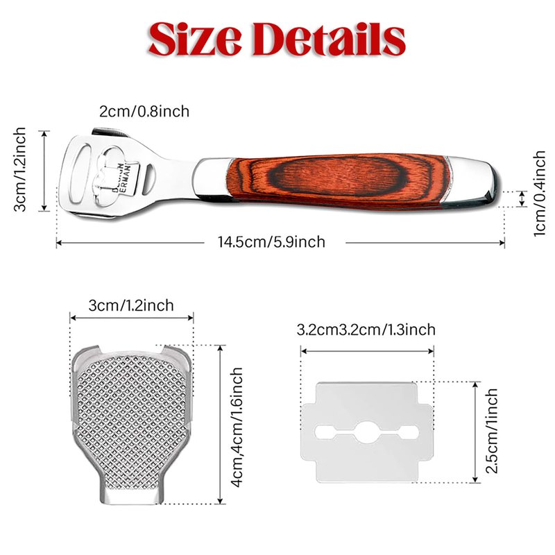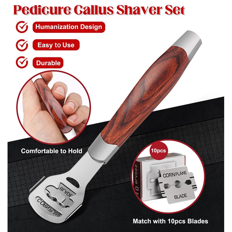 - 🏆[Premium Quality Callus Remover]: This Pedicure Callus Shaver Set is made of high quality stainless steel material and Unique Non-slip wood handle. So the foot file heel scraper for feet provides most comfortable grip and smooth control.