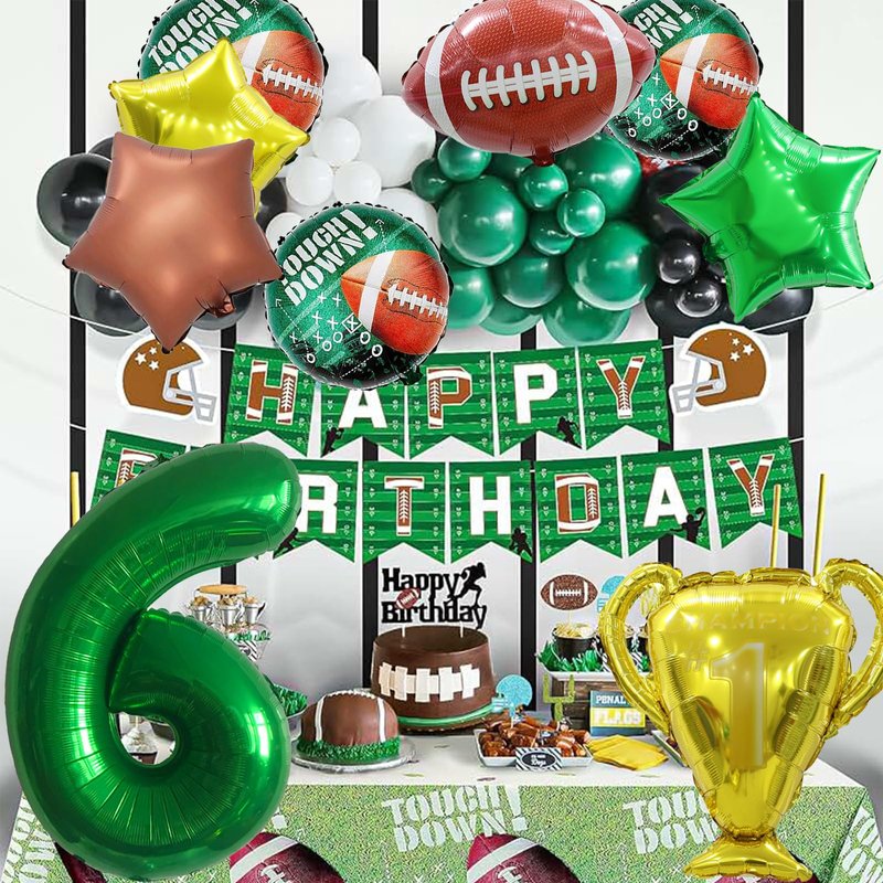 - Football Balloons: Football birthday party decorations with 14pcs, include 40 inch green number balloon, 3 (18 inch) football foil balloons, 3 (18 inch) football round green balloons, 3 (18 inch green gold brown) star balloons, 26 inch trophy cup balloon, 2 green ribbon and 1 straw. Everything you need to make the most exciting atmosphere in a complete sports theme birthday party decorations.