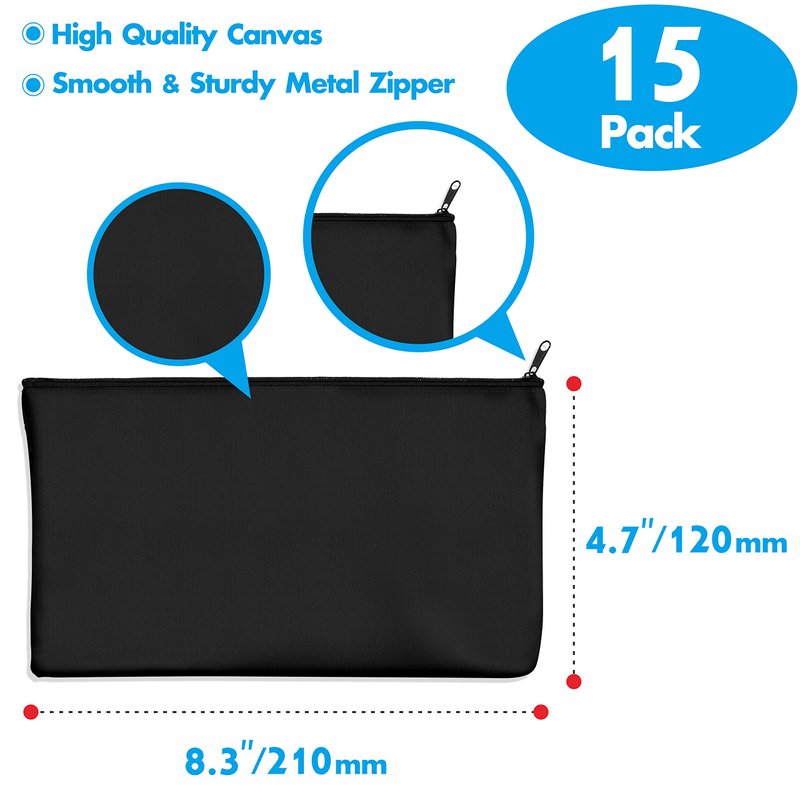 15 Pack Blank Cotton Canvas DIY Craft Zipper Bags Pouches Pencil Case for Makeup Cosmetic Toiletry Stationary Storage (Dark Black, 8.3” x 4.7”)