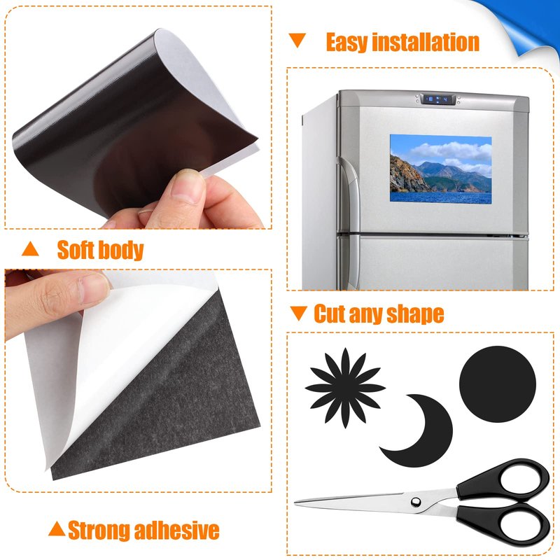 - Magnetic Sheets: magnetic sheets with adhesive One side is a shiny strong magnetic surface, and the other side is a sticky adhesive surface, all cuttable flexible magnetic sheets are rectangular single-sided magnetic and can be easily cut your need different sizes means prefer fit your picture/card/DIY project perfectly.