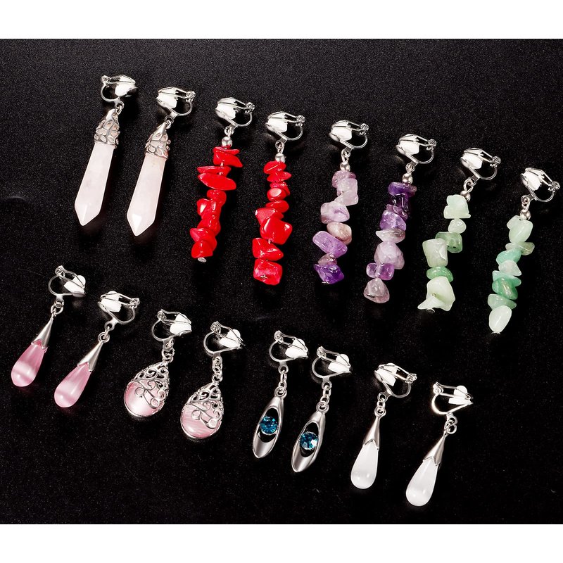 - 【 Multicolor Clip on Earrings Set】:You will get 15 pairs multi-style clip earrings in one package. 4 Pairs natural crystal earrings and 11 pairs artificial crystal earrings for women multipack.Such as: teardrop earrings for women,crystal point earrings,pink earrings,blue earrings,amethyst earrings and more.