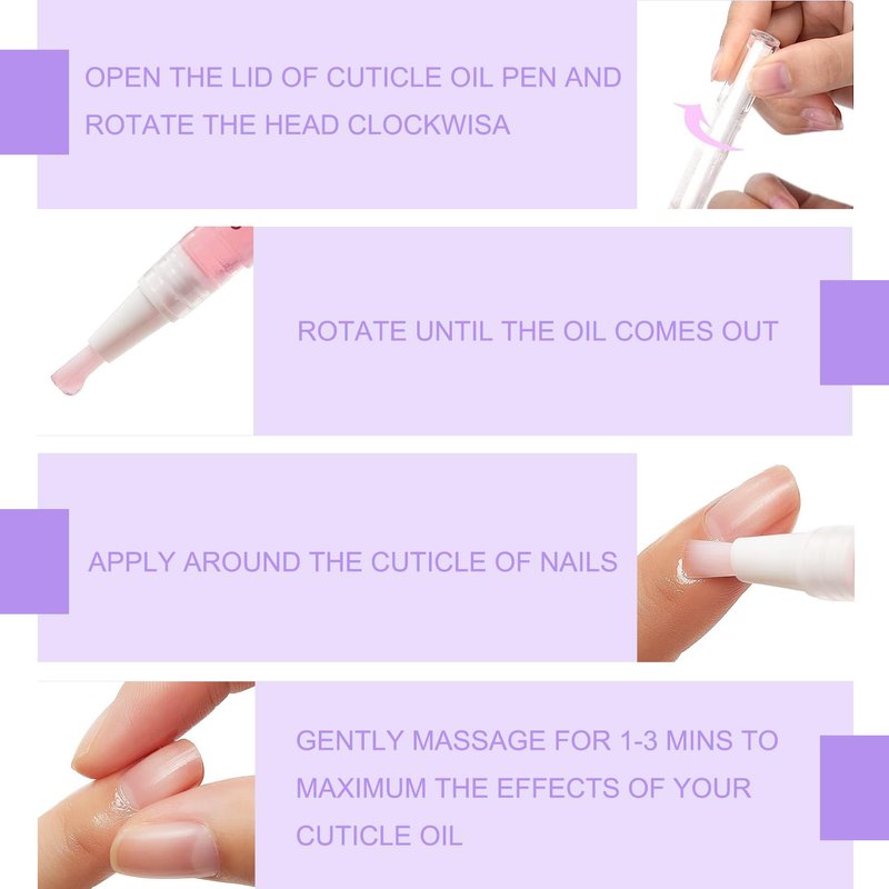 ✿Usage Steps: Gently rotate the tail of the cuticle pen oil to moisten the tip of the nutrient oil, then apply cuticle pen oil evenly on the edge of the nail, and gently massage until absorbed.