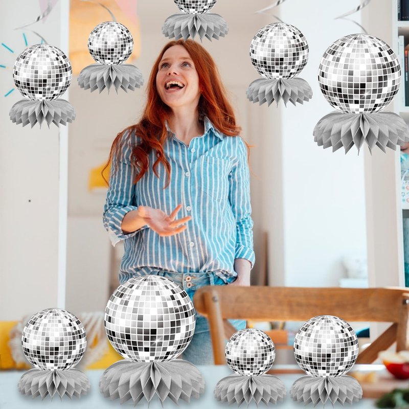 - This set of 15 pcs disco ball party decorations will add a unique touch to your 70s disco party table centerpieces.