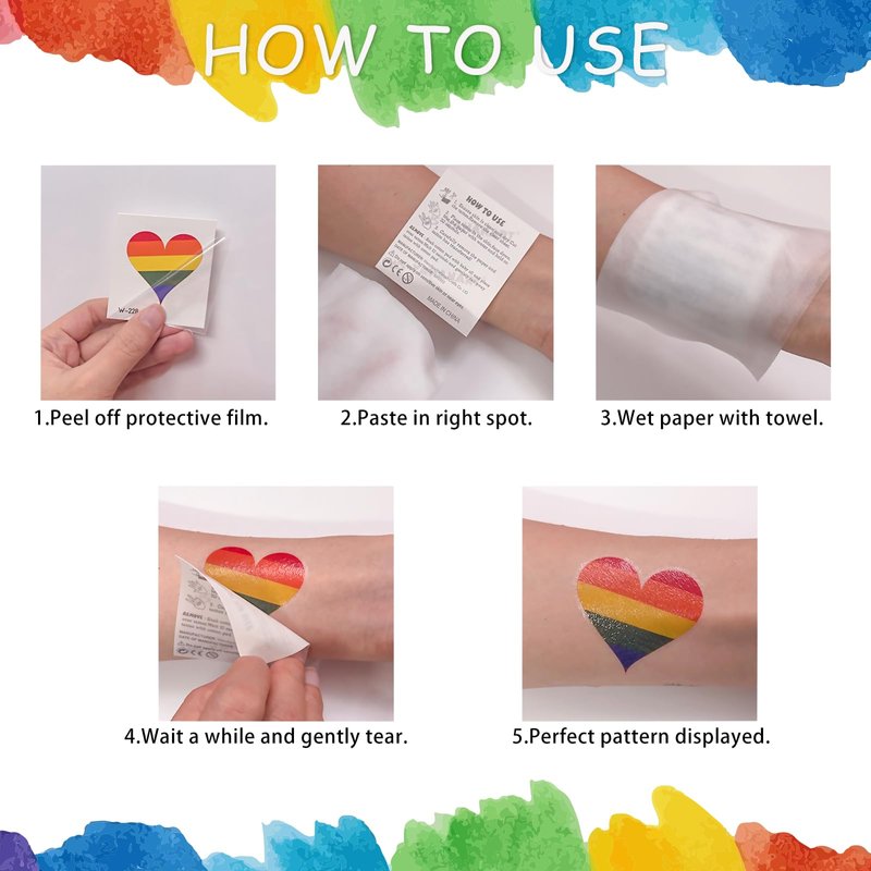 - RAINBOW TATTOOS IS EASY TO USE: Cut out your favorite gay Pride tattoo, dry your skin, peel off the transparent film and place the design face down on your skin, then cover with wet wipes, wait 20-30 seconds and peel off the backing paper, and you have a perfect pride temporary tattoo!