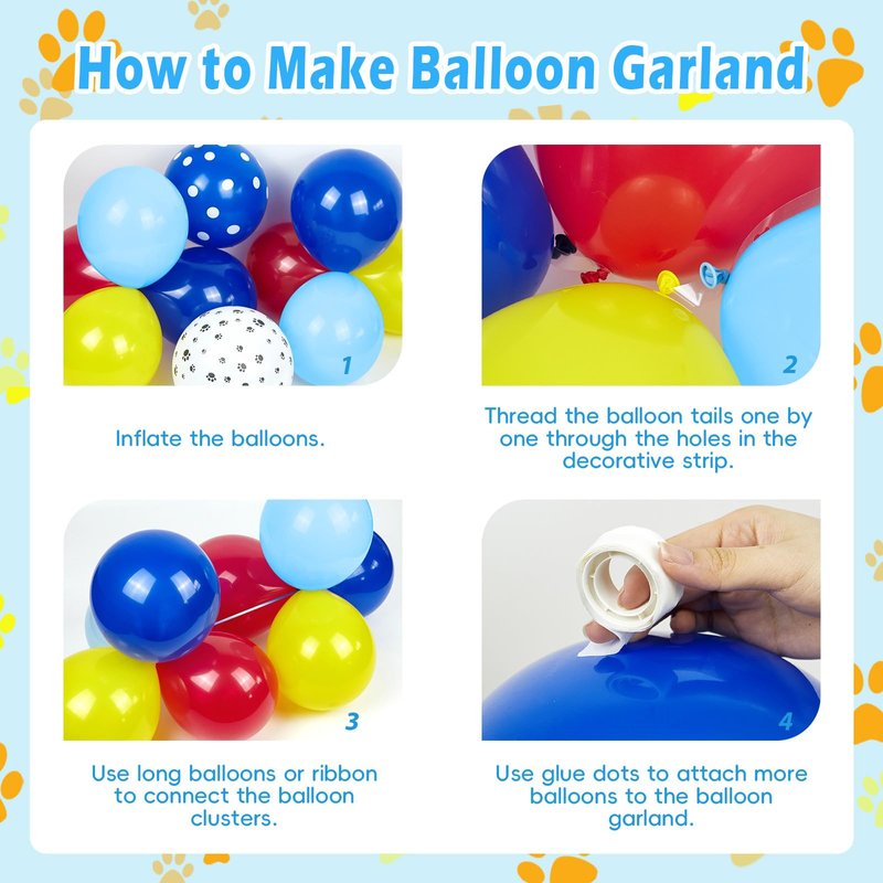 - Easy to Use: The paw balloon garland have white long balloons, ribbon, glue dot, decorative strip to help complete balloon arch kit more easily. first, Inflate the balloons with balloon pump, crossing each other to form some balloon clusters. Then, insert the balloon knot into the decorative strip hole, or tie them together with ribbon or long balloons to form balloon arch. Finally, hang it on the party backdrop, use glue dots to attach 5 inch balloons to fill gap area