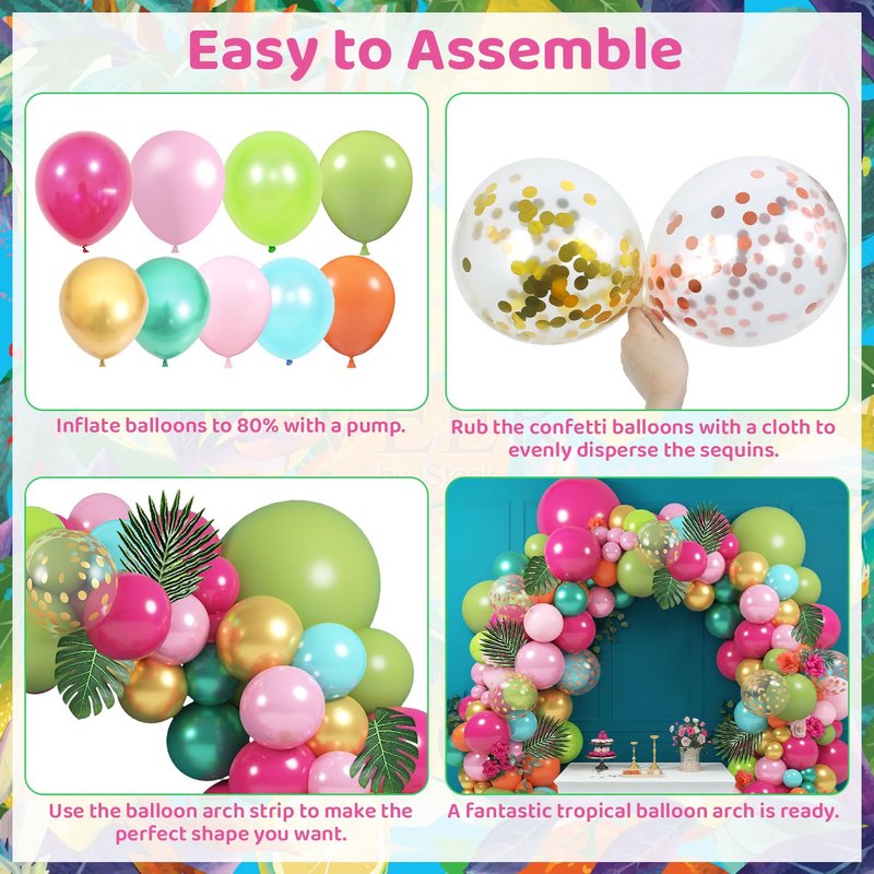 - Tropical Balloon Arch: You'll receive 2pcs 18"tropical balloons(pearlescent hot pink+olive green), 10pcs 12"rose gold/gold confetti balloons, 60pcs 12"10'balloons(15pearlescent light pink/15pearlescent hot pink/15pearlescent fruit green/15olive green), 28pcs 10''5"metallic balloons(8green/20gold), 24pcs 10"balloons(8pearlescent aqua blue/8baby pink/8orange), 20pcs 5"balloons(10pearlescent light pink/10pearlescent hot pink), 10pcs 10"8"palm leaves and 4pcs balloon tools.