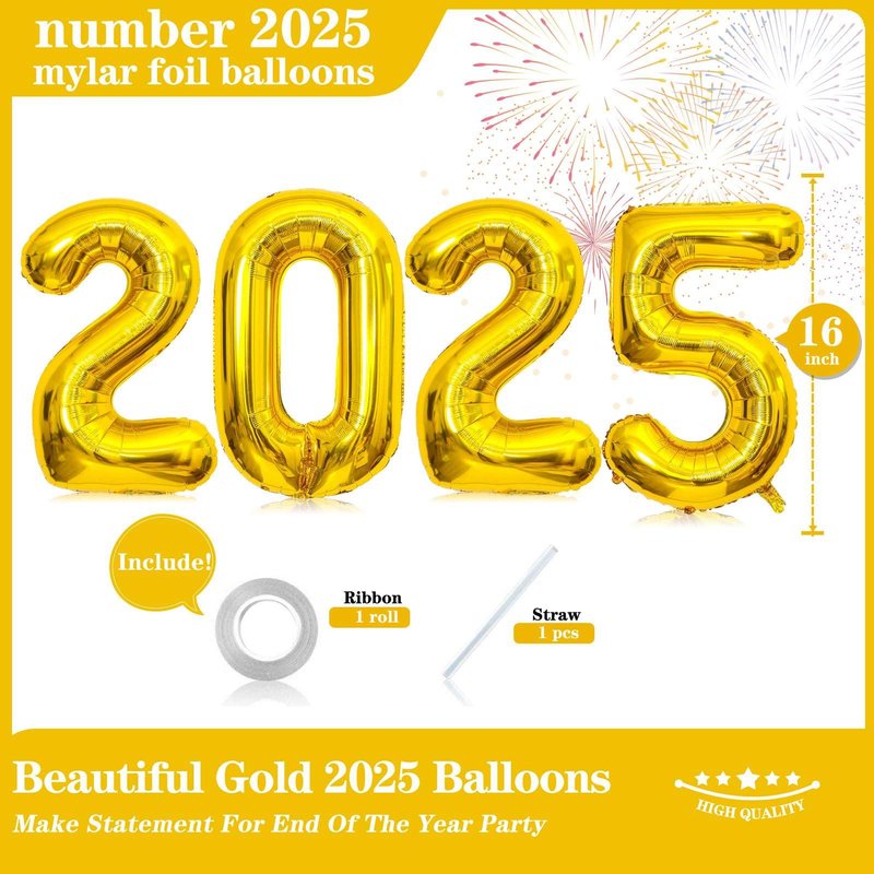 • WHAT YOU WILL RECEIVE: You will receive a set of 16-inch Gold 2025 Number Balloons (uninflated), along with a 33-foot roll of ribbon and one straw. These 2025 number balloons are designed to fulfill your balloons needs for a New Year-themed party.
