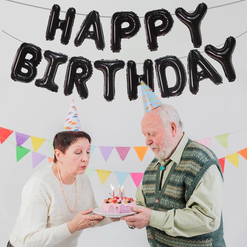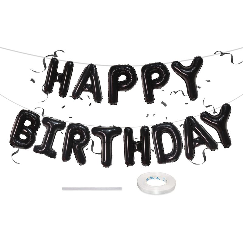 - 🎂 Happy Birthday Balloon Banner 🎂 - You will get 13pcs 16 inch "HAPPY BIRTHDAY" black letters foil balloons(uninflated), 1pc ribbon and 1pc straw to help you set and hang the Happy Birthday balloon bunting up.
