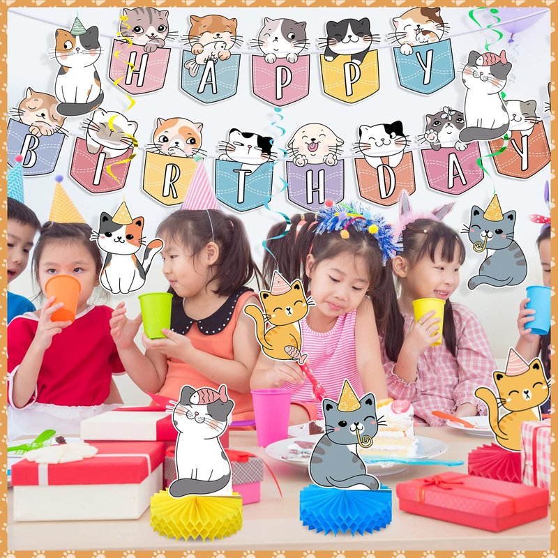 - Adequate to Meet Your Needs: you will receive 16 pieces of items of the cat birthday party decorations in the total, including 1 piece of cat party banner, 6 pieces of cat party hanging cutouts, 6 pieces of hanging swirl decors, and 3 pieces of birthday honeycomb decorations, very useful for you to decorate on parties