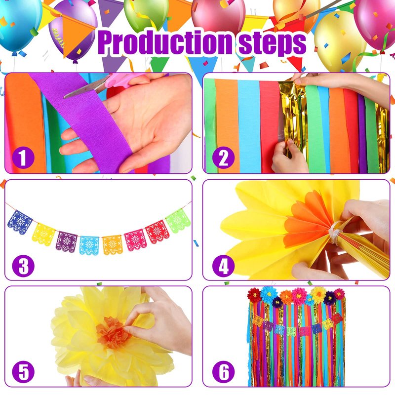 - Simple to Use: our Mexican party decorations are simple to use, just unroll the crepe paper streamers and then stick them to the wall, add the tissue flower with provided glues according to your needs, you can freely match their colors to your liking, just use your imagination and creativity to DIY your own ornaments