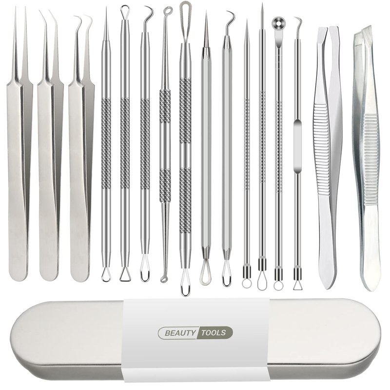- 1. Set configuration: 2024 Latest Qimouwp 16 piece set tools, 1 storage box, 14 acne removal needles, remove all kinds of stubborn acne, blackheads, whiteheads, comedones, abscess, the right tool for different situations Can be used with 2 clips, for eyebrows, nose care, a set of tools for whole face care.