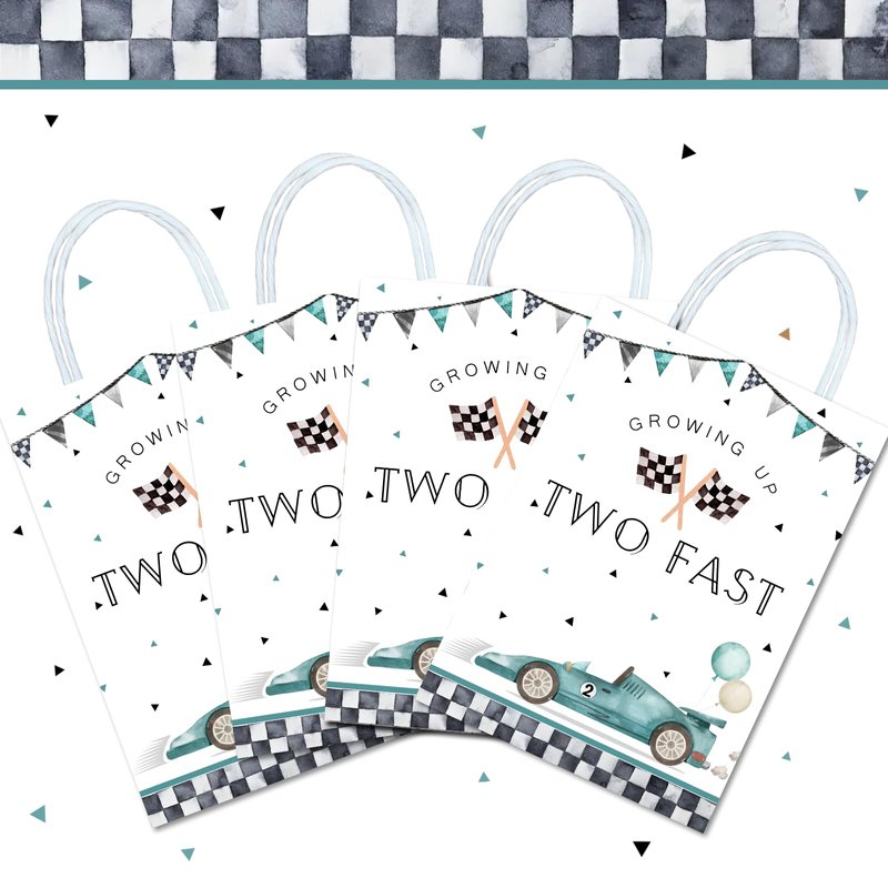 - Racing Car Treat Bags are designed with Race Car patterns which are in line with the the theme of Two Fast parties, creating a strong atmosphere, fit well with your other Race Car party decorations such as Race Car party banner backdrop,Race Car party table kit,Race Car toys and so on
