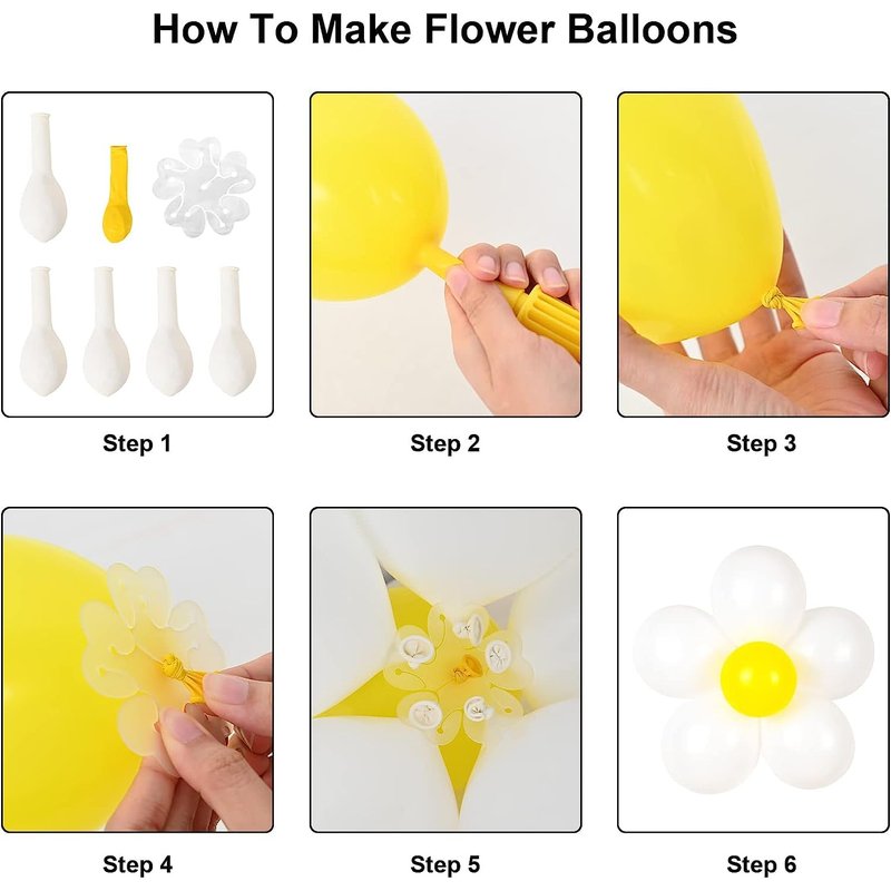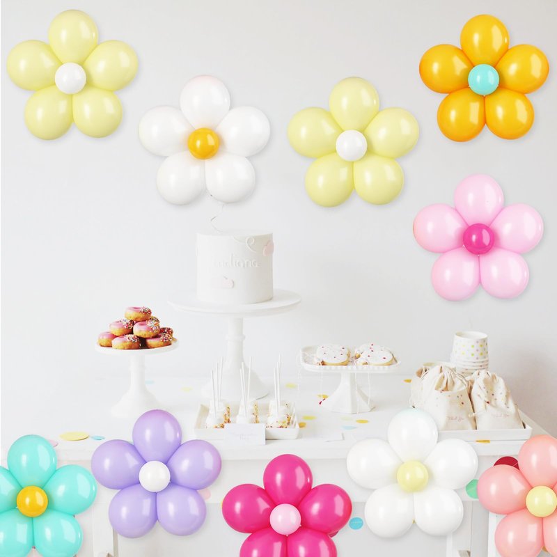 - 🌼DIY DAISY BALLOONS:Choose 6 balloons of the colors you want is inflate,5 for side and 1 for the middle,secure with double-layer plum buckle and glue points.and then you can get a prefect daisy flower balloon and hang it on the wall,door or any place you want to decorate.