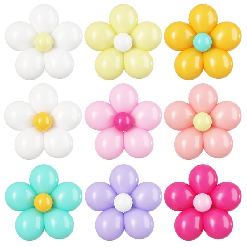 - 🌼FLOWER BALLOON KIT:The daisy balloon kit includes 96pcs latex balloon in pastel blue,pastel pink,pastel yellow,pastel orange,pastel purple,retro yellow,rose red,white,16pcs double-layer plum buckle,100 pieces glue points.you can DIY 16 sets daisy balloons of different color balloons according to decorate your party with this latex balloons.