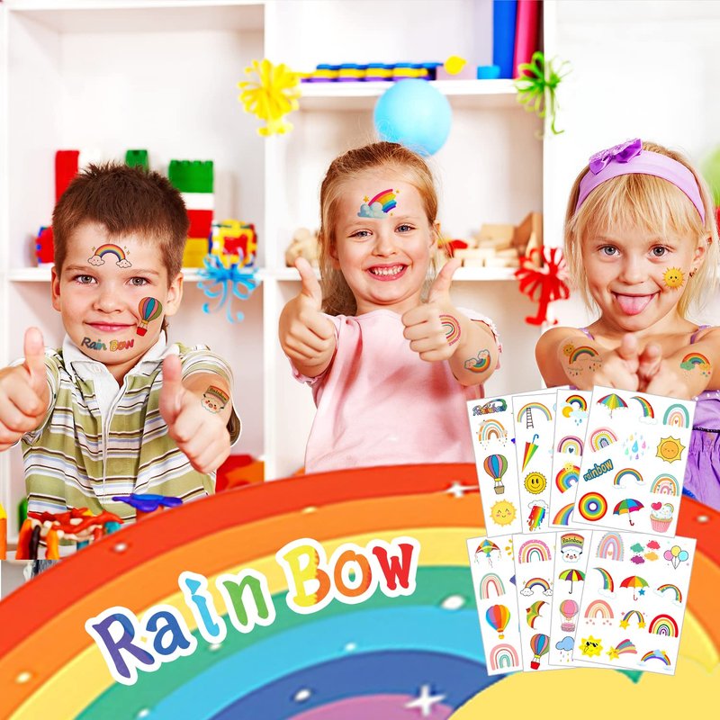- Premuim Rainbow Tattoos: These tattoos made of high quality safety and green paper, Non-allergenic and totally safe for skin. Let them enjoy the party better. These cute Rainbow temporary tattoo stickers including various cartoon characters, colors are bright, and designs are adorable, which are attractive to the activity